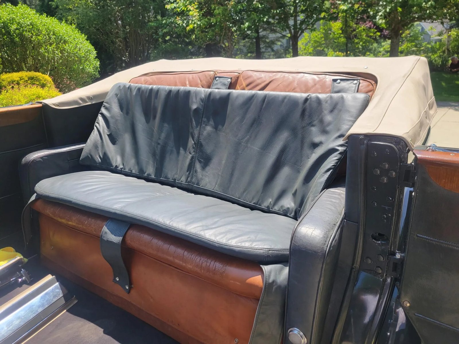 A snap-on gray leather seat cover is fitted, and cracks in the brown seat upholstery and robe cord can be seen in the gallery along with discoloration on the interior panels and scratches on the wood trim.