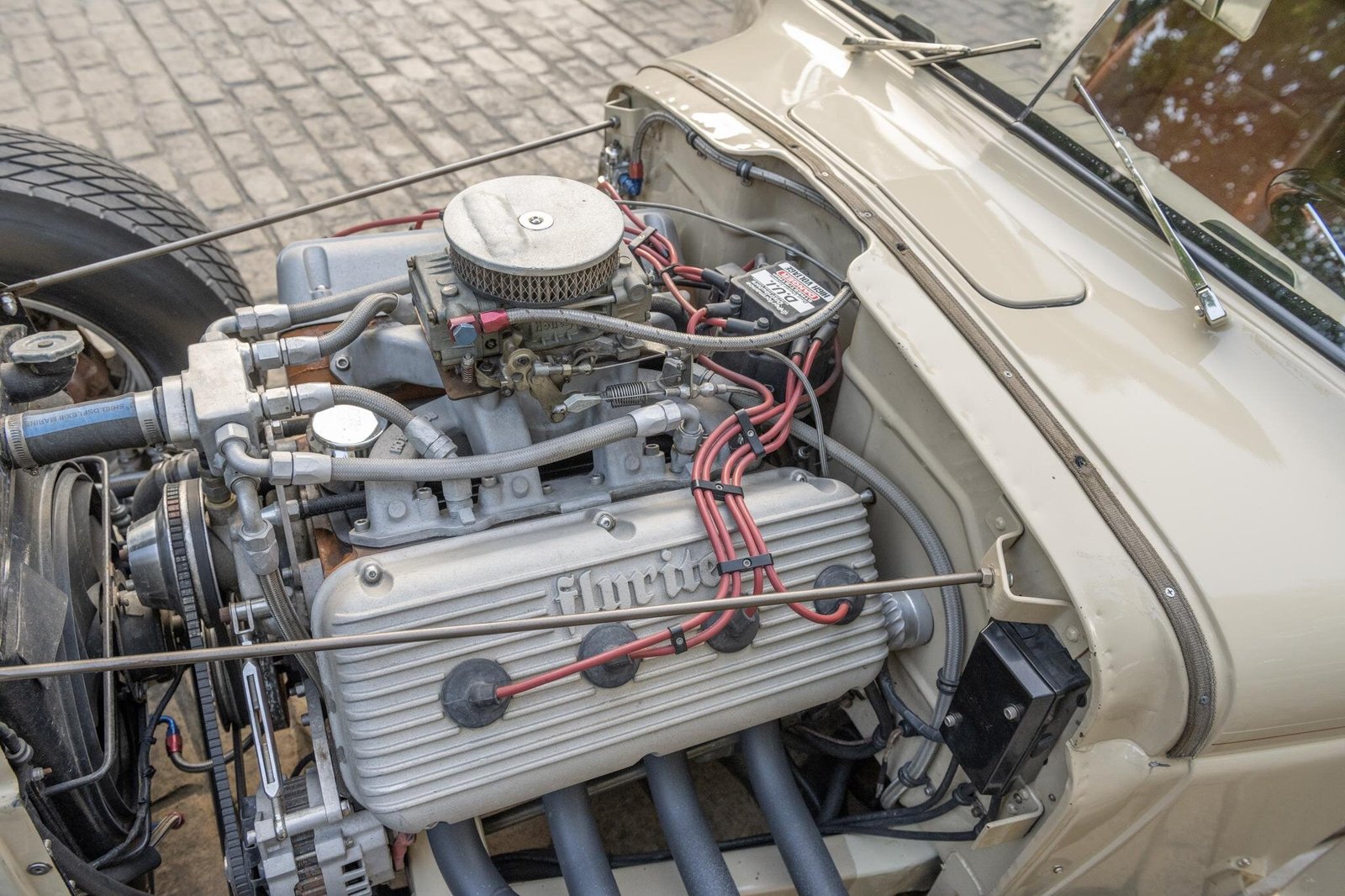 The 331ci Hemi V8 features a Hot Heads dual-plane high-rise intake manifold topped with a Holley four-barrel carburetor along with a pair of vintage Flyrite valve covers.