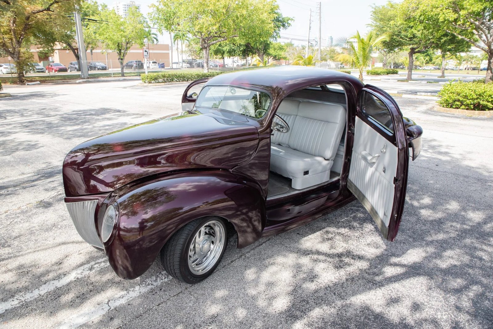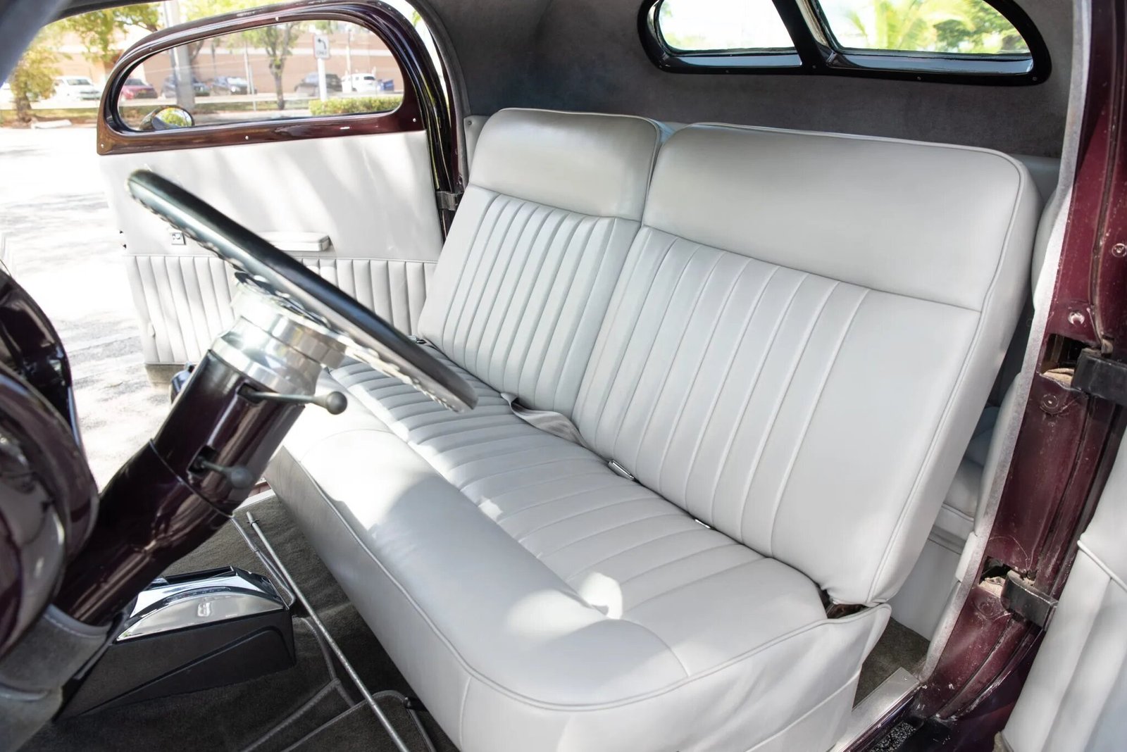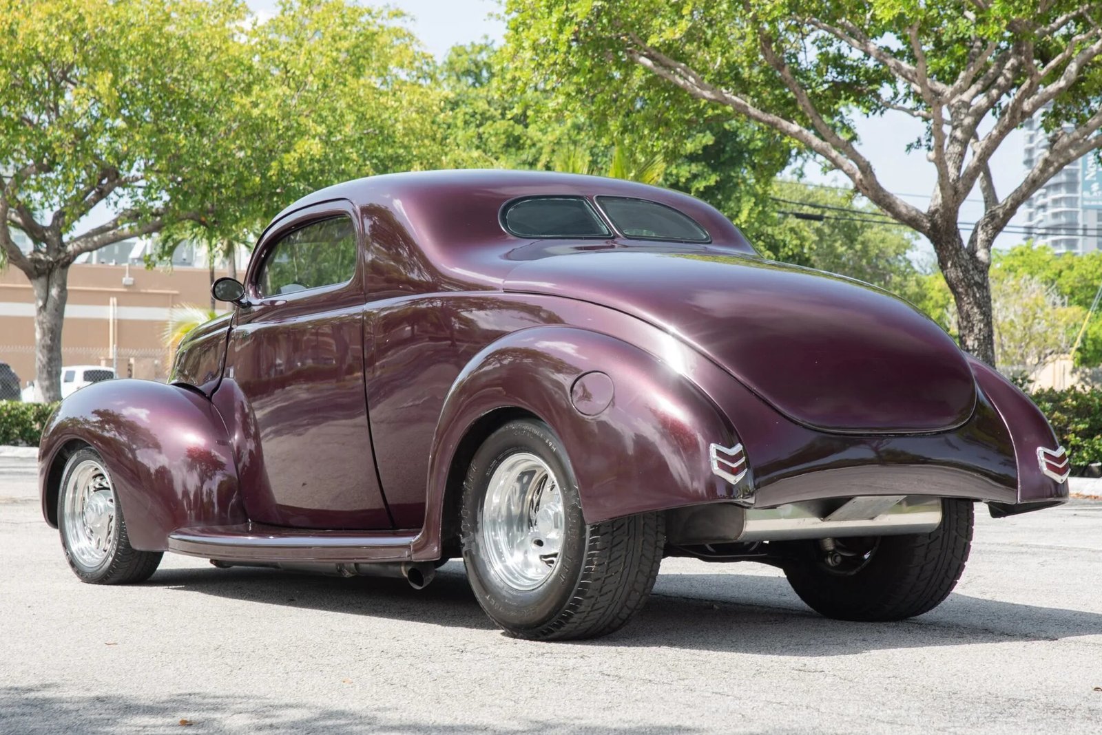 Features include a chrome grille, shaved door and trunk handles, rear-hinged doors, a flush-mounted fuel door, a split rear window, and dual side-exit exhaust outlets.