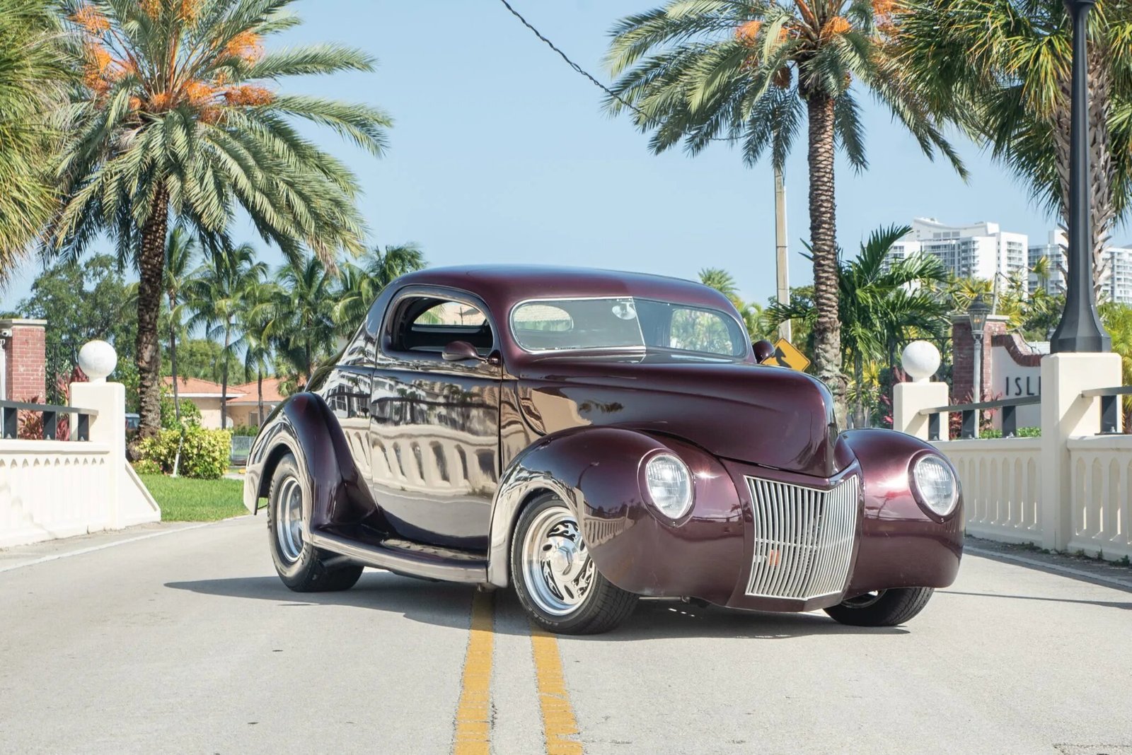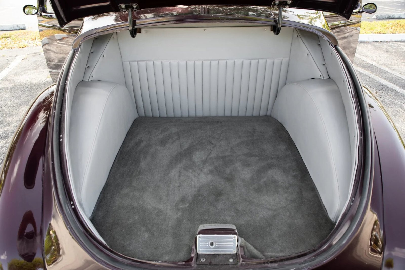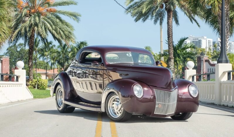 Features include a chrome grille, shaved door and trunk handles, rear-hinged doors, a flush-mounted fuel door, a split rear window, and dual side-exit exhaust outlets.