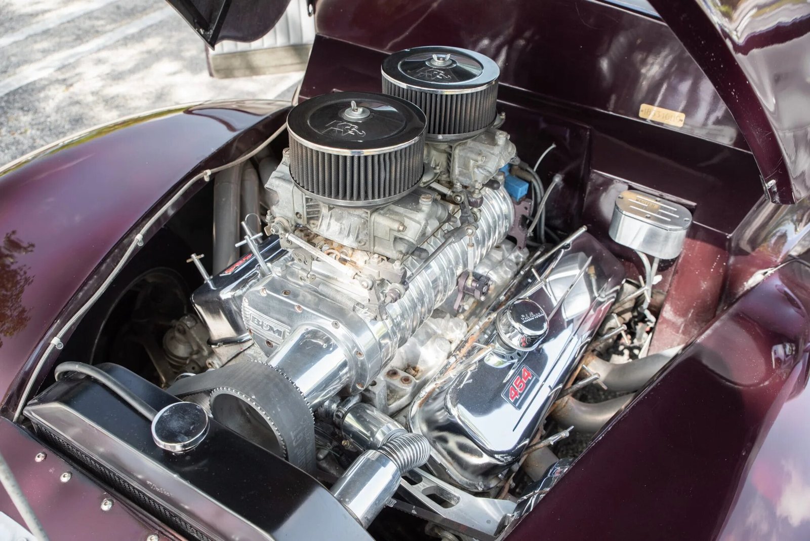 The replacement 454ci V8 was installed and features a B&M roots-style supercharger, dual Holley four-barrel carburetors, stainless headers, and chrome 454-branded valve covers.