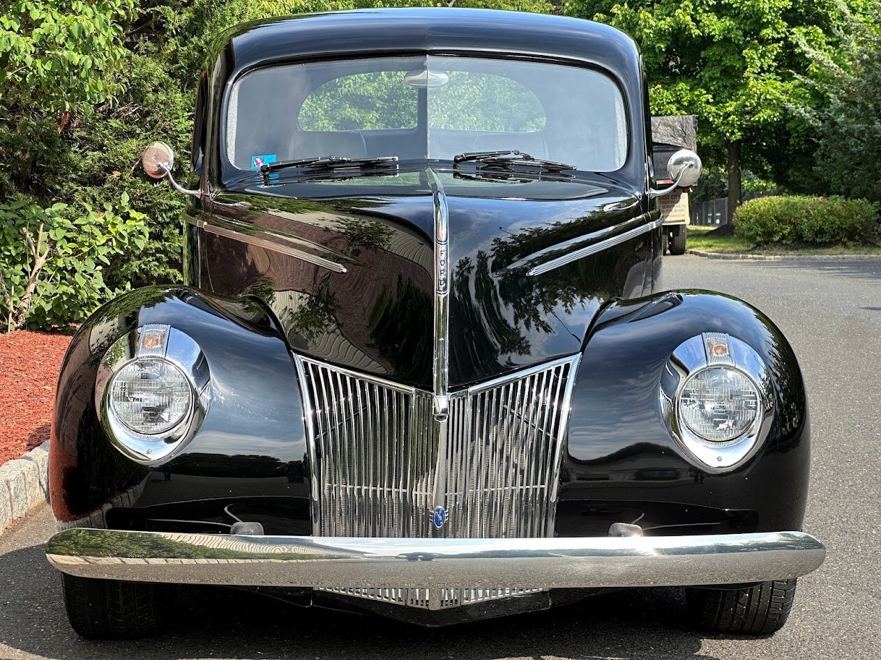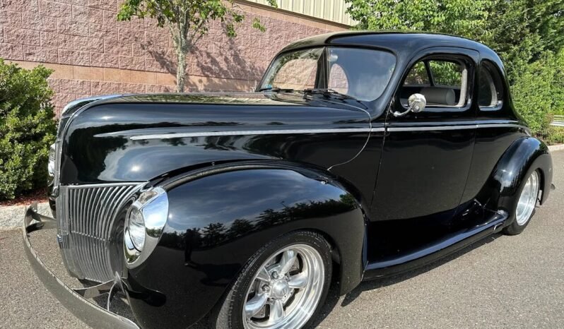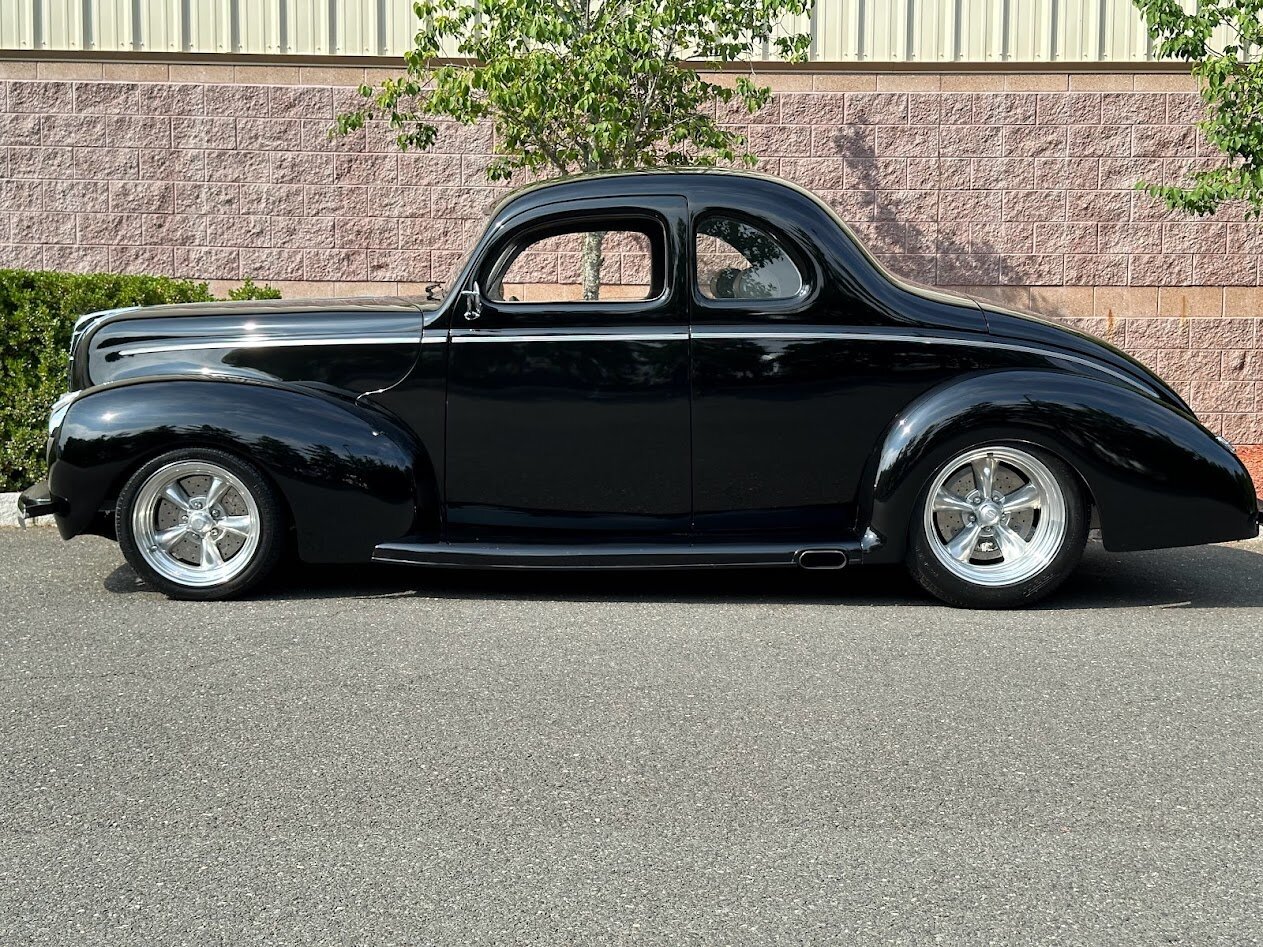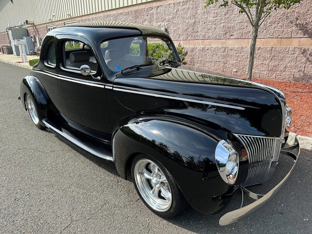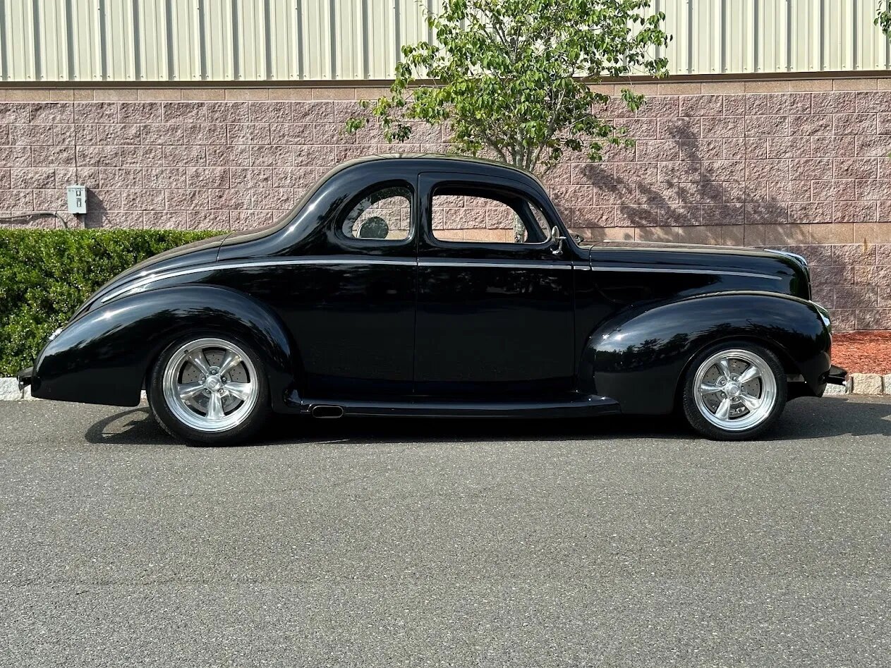 This Ford Deluxe coupe is powered by a 460ci V8 and was built using a P&J Hot Rods chassis and fiberglass body. The car is finished in black over gray leather and equipped with a four-speed automatic transmission, 16″ American Racing wheels, an Air Ride Technologies suspension system, power-adjustable seats, a Vintage Air climate control system, power windows, and a three-spoke steering wheel.