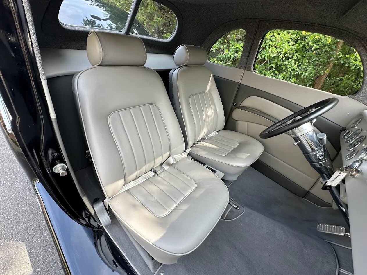 A fabric headliner is also installed, and additional equipment includes gray carpets, lap seatbelts, power windows, electric door poppers, a Vintage Air climate control system, and control for the suspension system.