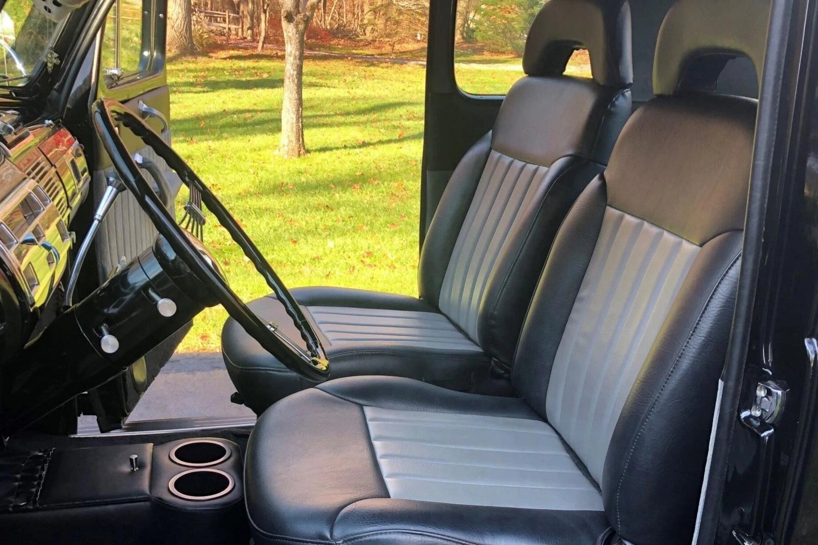 The cabin houses seats sourced from a late-model Chevrolet Blazer that are trimmed in black vinyl with gray inserts.