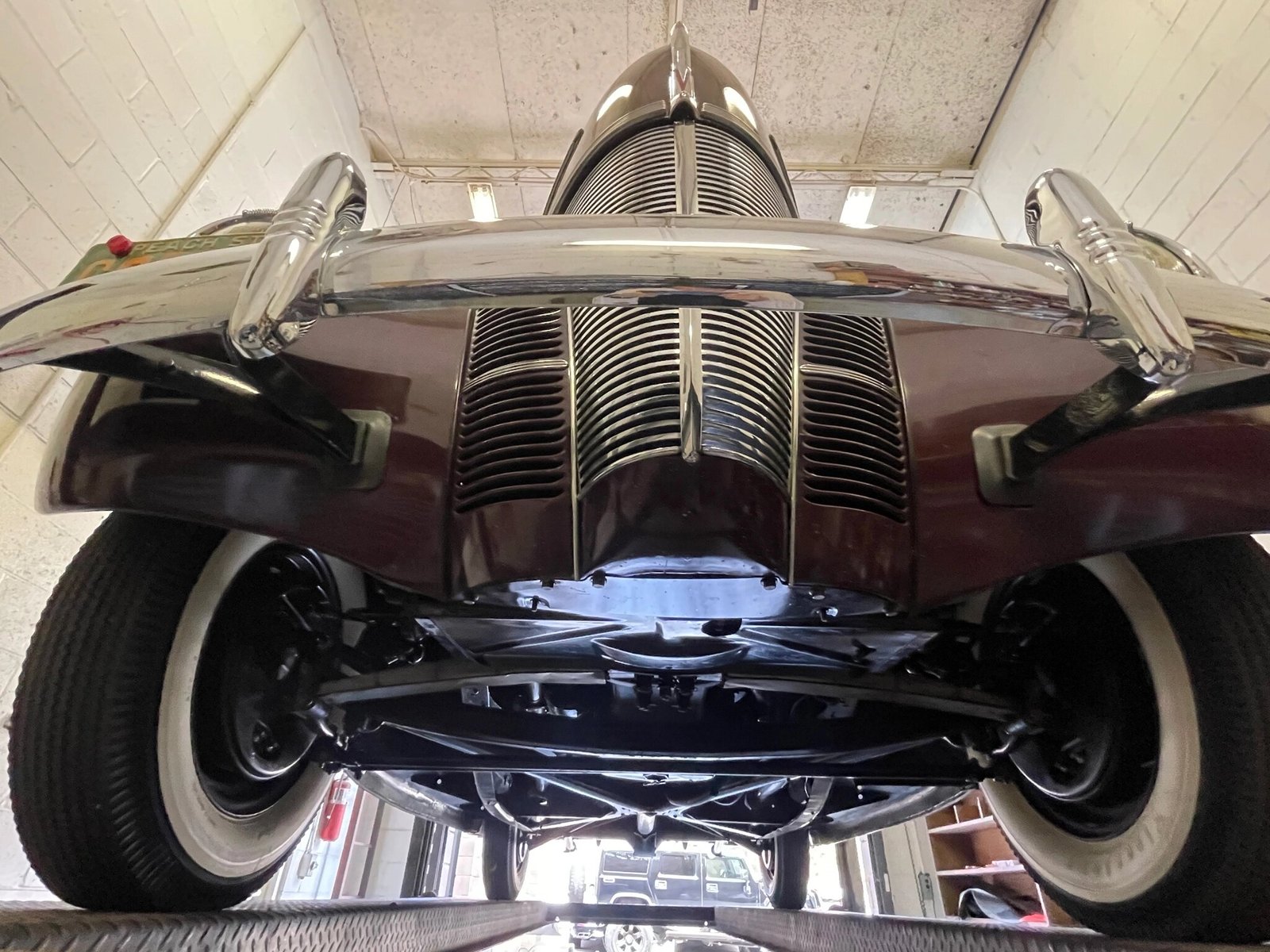 The car is finished in maroon over tan cloth upholstery, and its 221ci flathead V8 is paired with a column-shifted three-speed manual transmission.