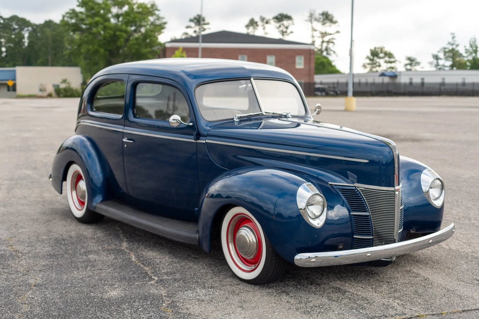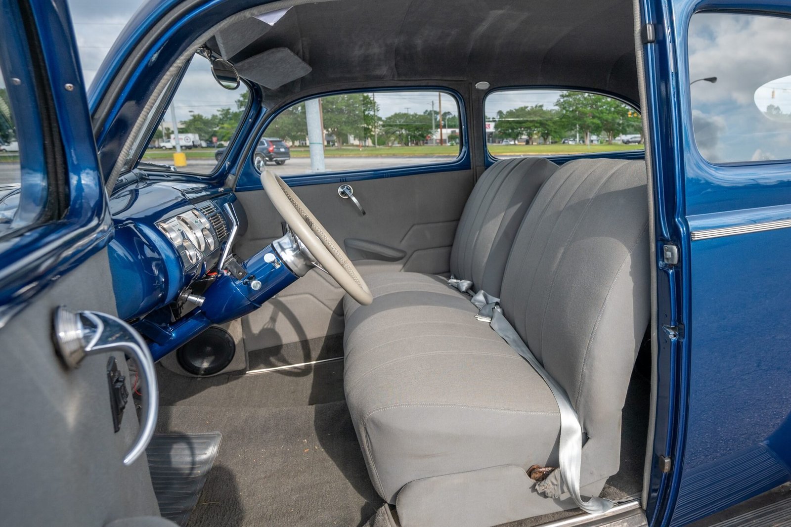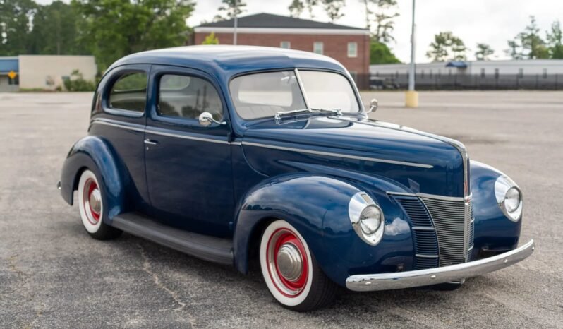 This 1940 Ford Deluxe Tudor Sedan was modified in the mid-2000s in a build that included a repaint in blue over a reupholstered gray cloth interior and the installation of a GM 327ci V8, a three-speed automatic transmission, and a Ford 8″ rear end. Additional modifications included a Mustang II front end with power rack-and-pinion steering and power front disc brakes as well as air conditioning and power windows. A subsequent service included replacing the front brake rotors, master and rear wheel brake cylinders, control arms, alternator, front tires, and fuel-tank sending unit as well as changing the oil, flushing the brakes, repacking the front wheel bearings, lowering the rear end by 2″, and installing a front coil spring ride-height adjustment kit, front and rear sway bars, an aluminum radiator, exhaust resonators, and a CD receiver.