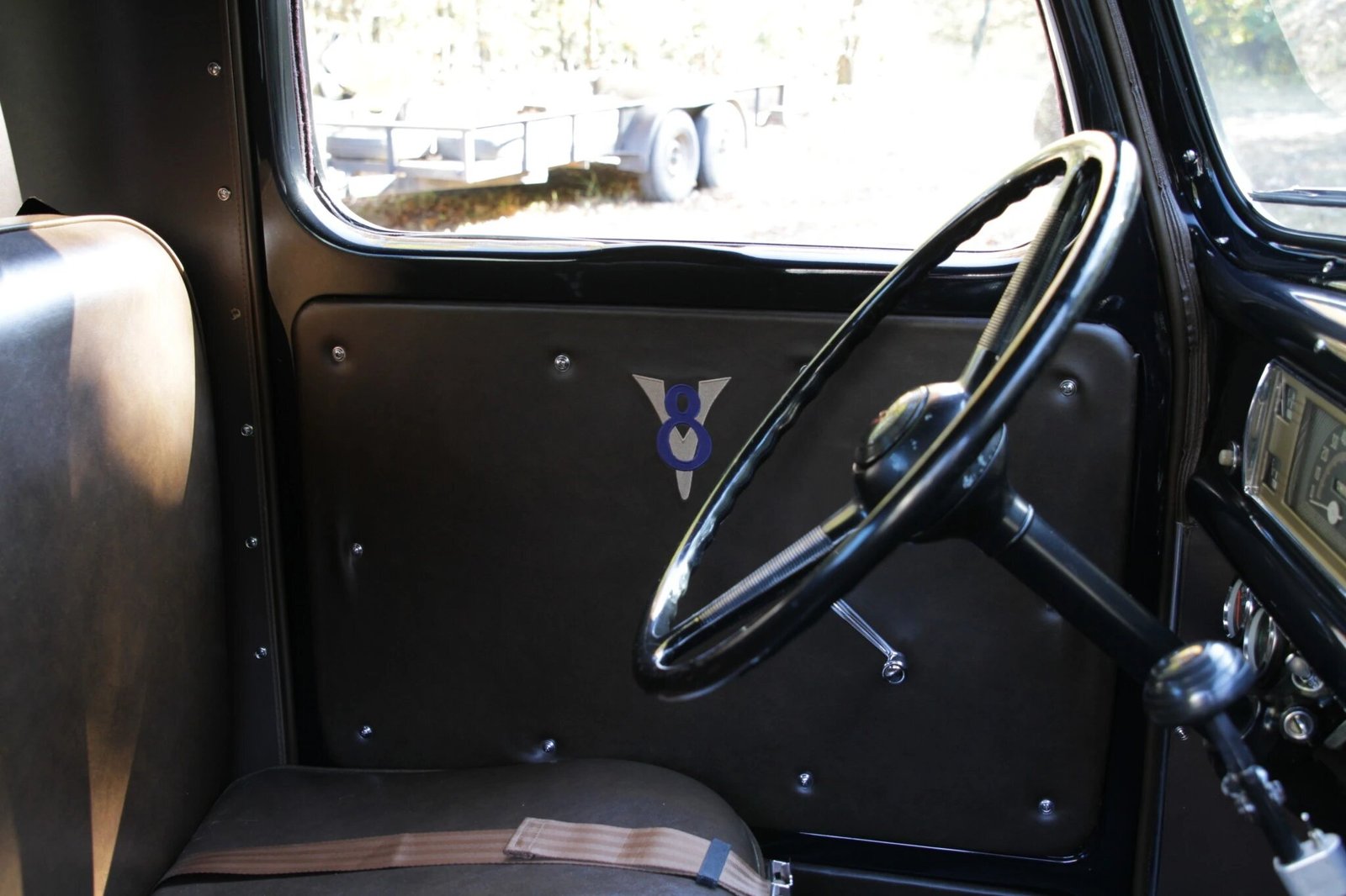The interior features a bench seat and door panels reupholstered in brown vinyl with embroidered V8 logos, rubber floor coverings, a stock steering wheel, and a floor-mounted shifter.
