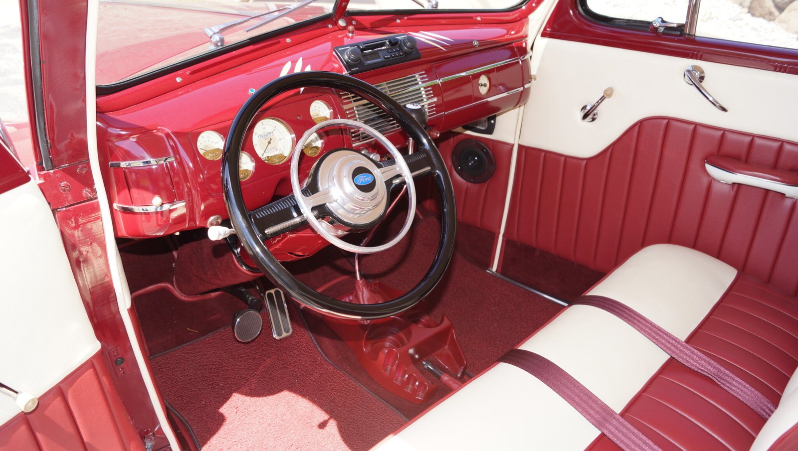 The interior is finished in white and red vinyl upholstery with a matching carpet kit.