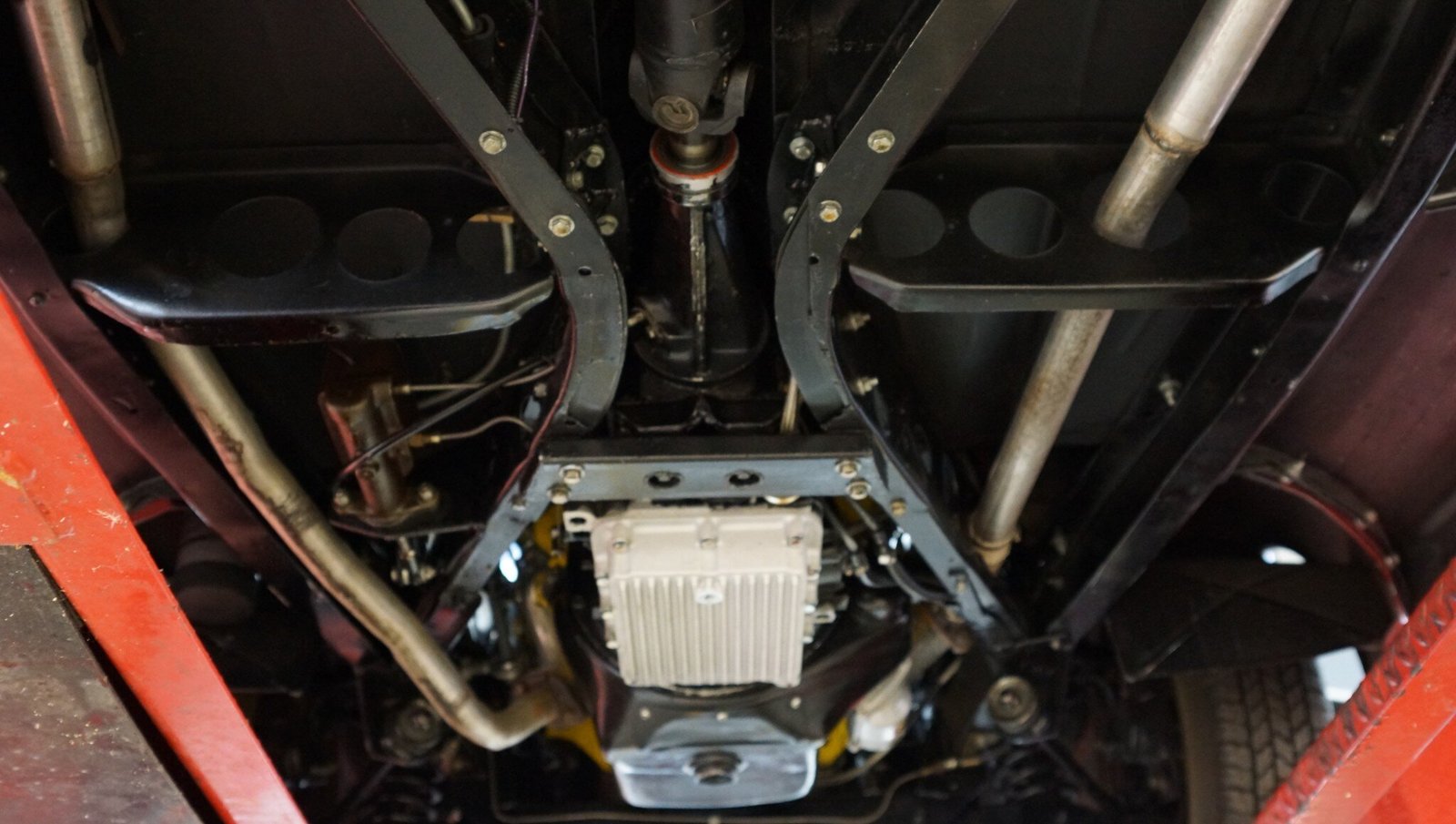 Fiberglass front and rear fenders were added prior to a repaint in the current deep red finish, and special attention was made to door gaps and panel alignment.