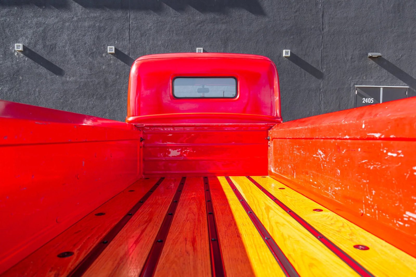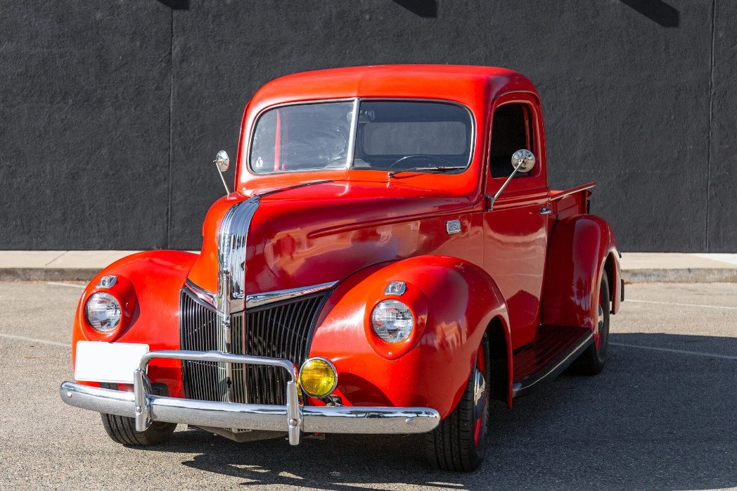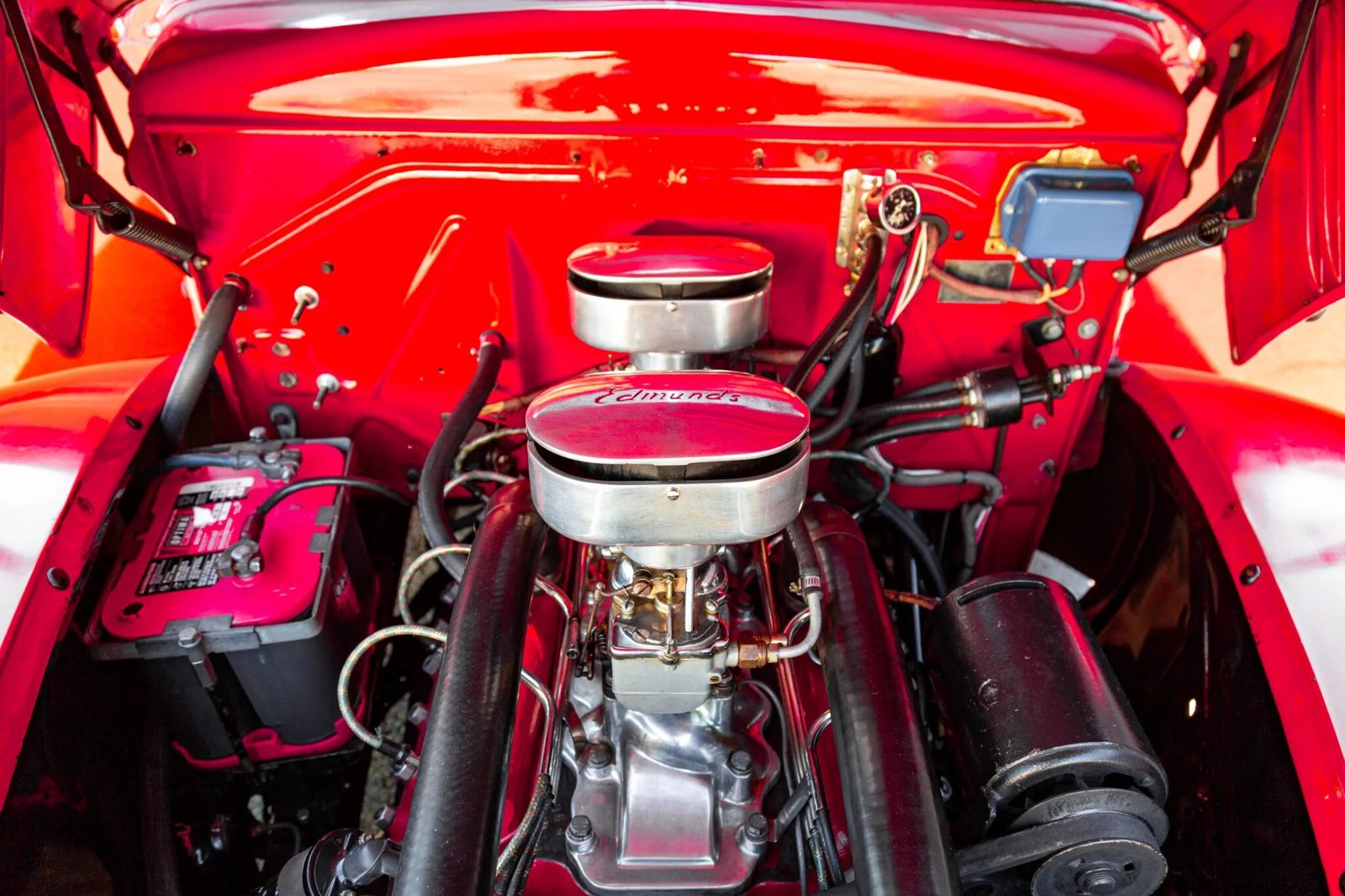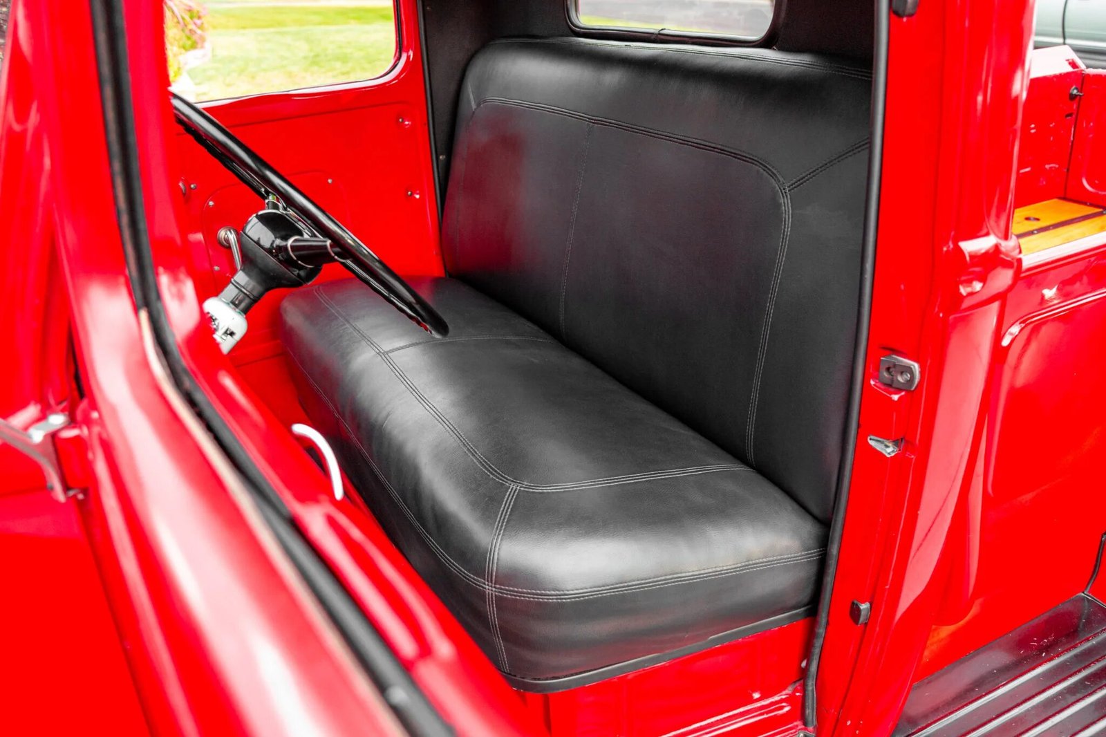 This 1941 Ford pickup truck is finished in red over black, and its Ford flathead V8 is paired with a three-speed manual transmission and a Columbia two-speed rear axle.
