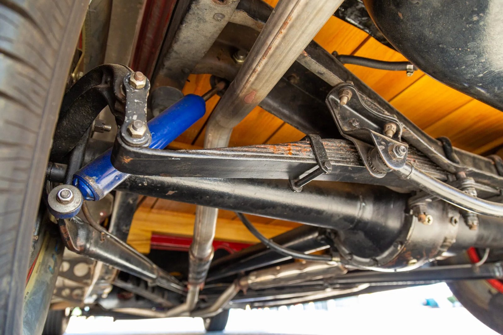Red-painted 15″ steel wheels wear Ford hubcaps and are mounted with BFGoodrich Advantage T/A tires.