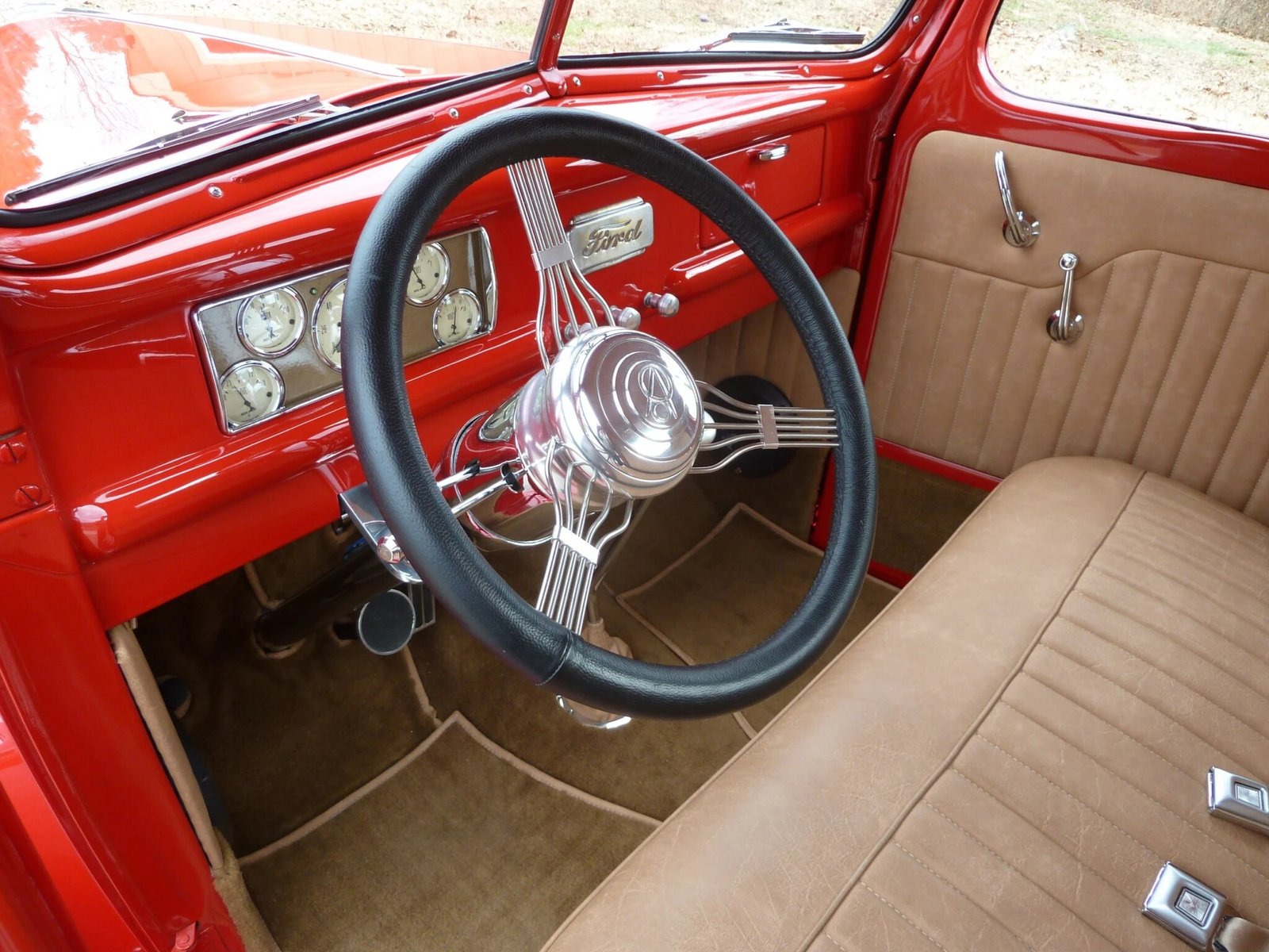 The leather-wrapped banjo steering wheel is mounted on a General Motors-style tilting column ahead of a steel dash painted to match the exterior.