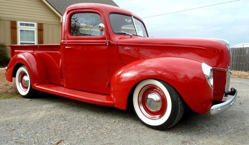 Modifications include tucked front and rear bumpers, the addition of a steel rear roll pan, smoothed tailgate latches, a 1940 hood trim, an LED third brake light and front turn signals, and a Hagan pop-up fuel door.