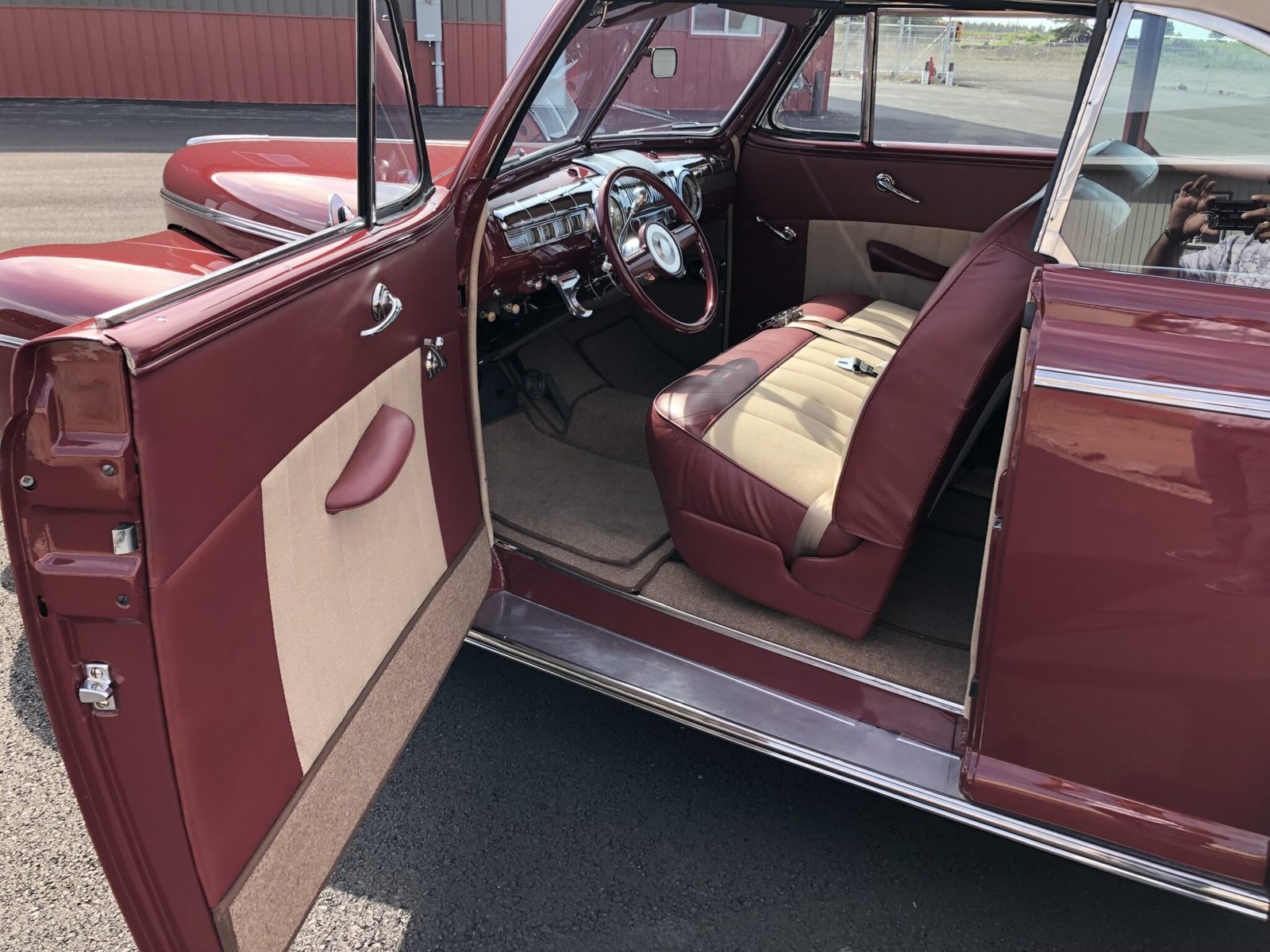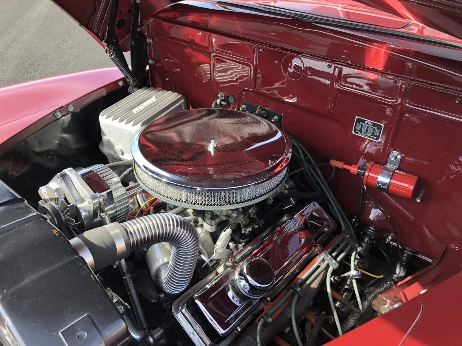 This 1942 Ford Super Deluxe convertible is a modified example that is powered by a 350ci Chevrolet V8 paired with a three-speed Turbo 350 automatic transmission. Finished in burgundy over a two-tone red and tan interior, the car has been fitted with power steering, front disc brakes, a 20-gallon fuel tank, an aftermarket exhaust system, and a 9″ rear end.