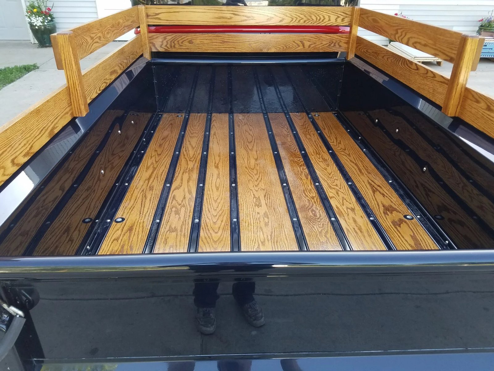 The bed features stained plank flooring separated by strips painted to match the body as well as matching stake sides.