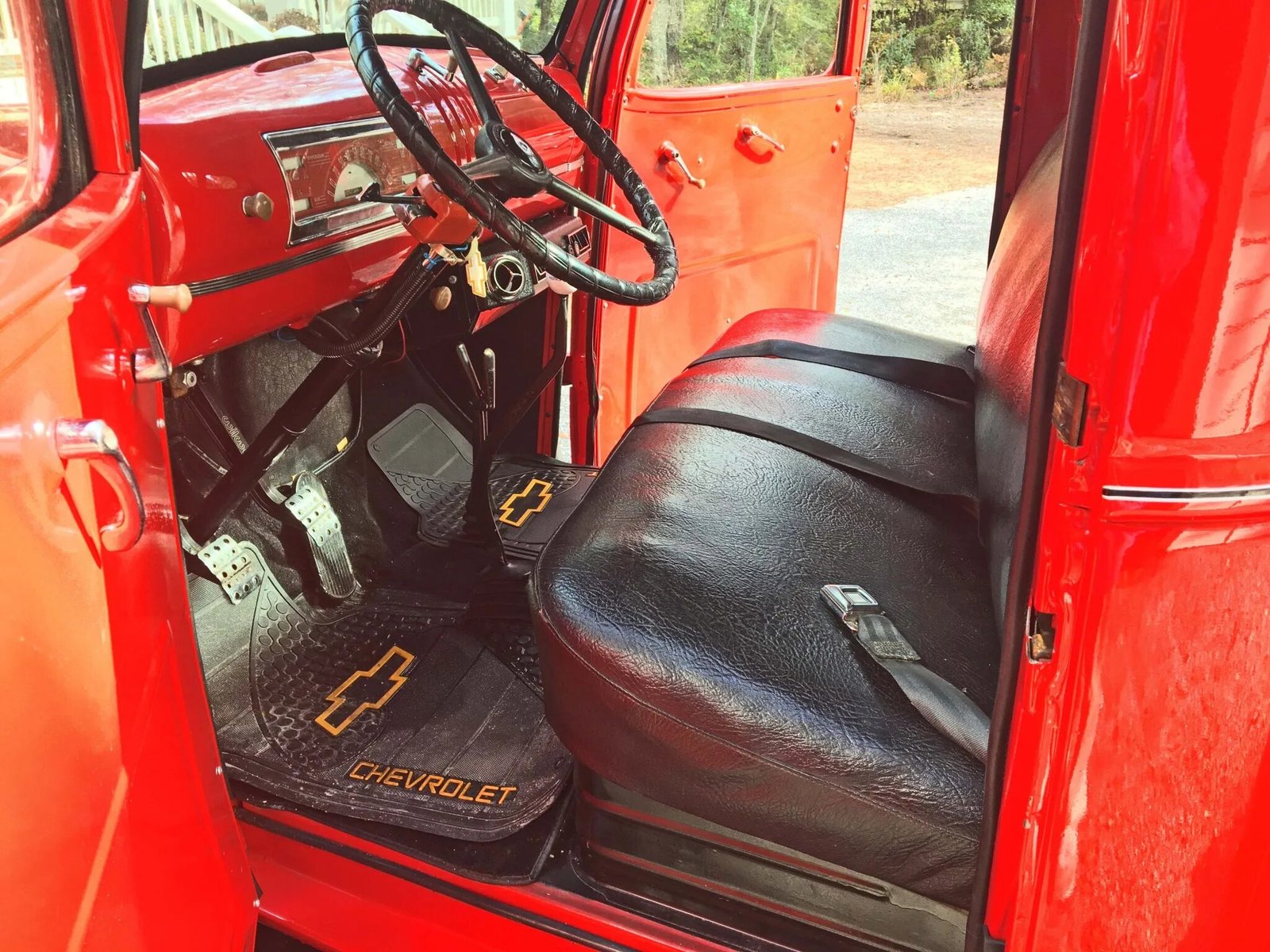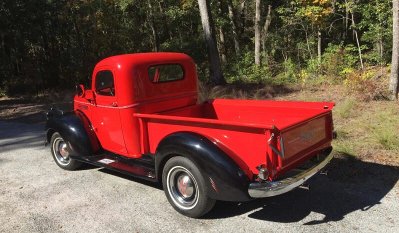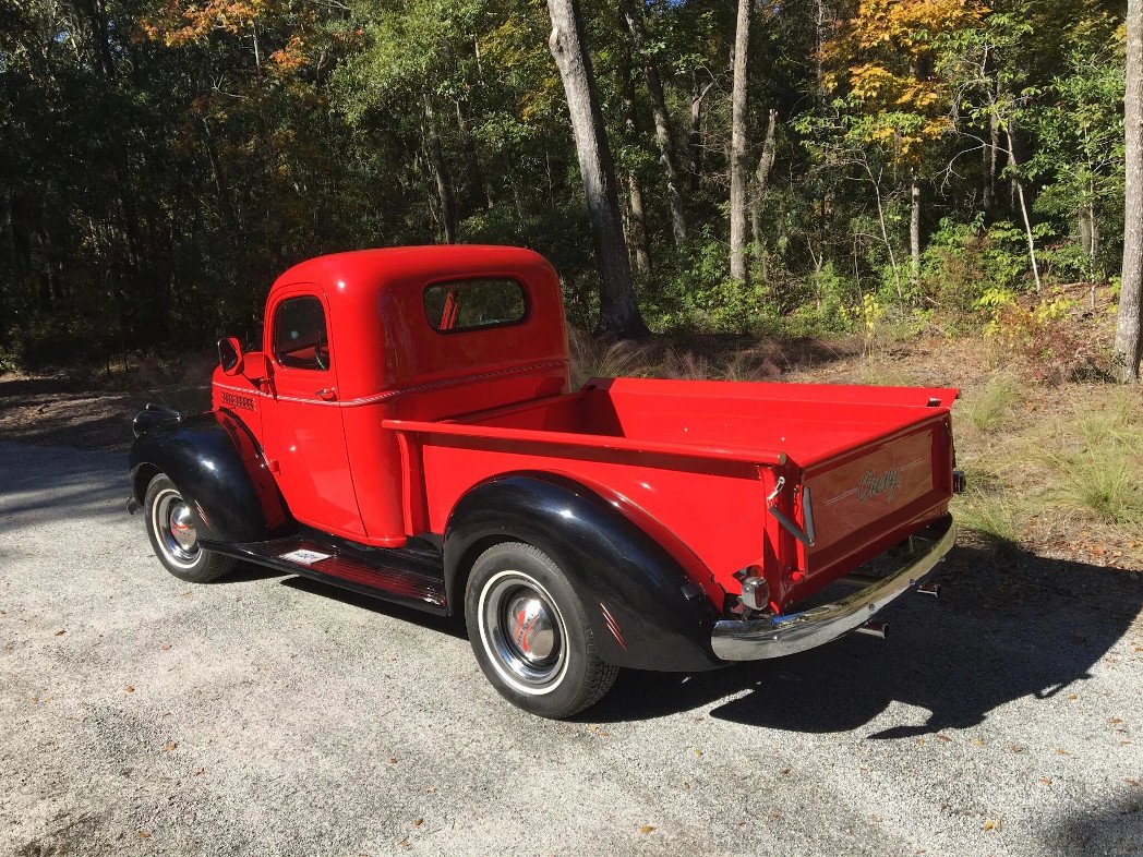 This 1946 Chevrolet pickup is powered by a 235ci Blue Flame inline-six and has been refinished in red and black over a matching interior.