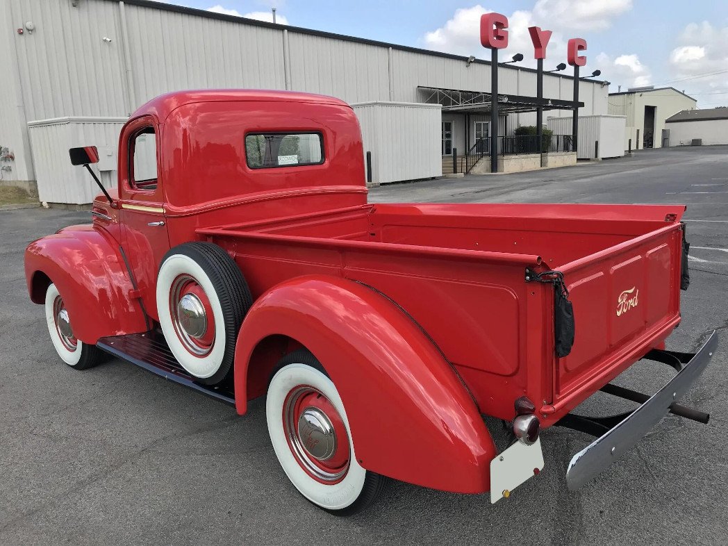 This 1946 Ford 1/2-ton pickup is powered by a 239ci flathead V8 paired with a three-speed manual transmission and is finished in red over green vinyl upholstery. Equipment includes red-painted 16″ wheels, a split windshield, black running boards, chrome bumpers, vent windows, a cab heater, and wooden bed slats with metal runners. The whitewall tires were replaced in preparation for the sale.