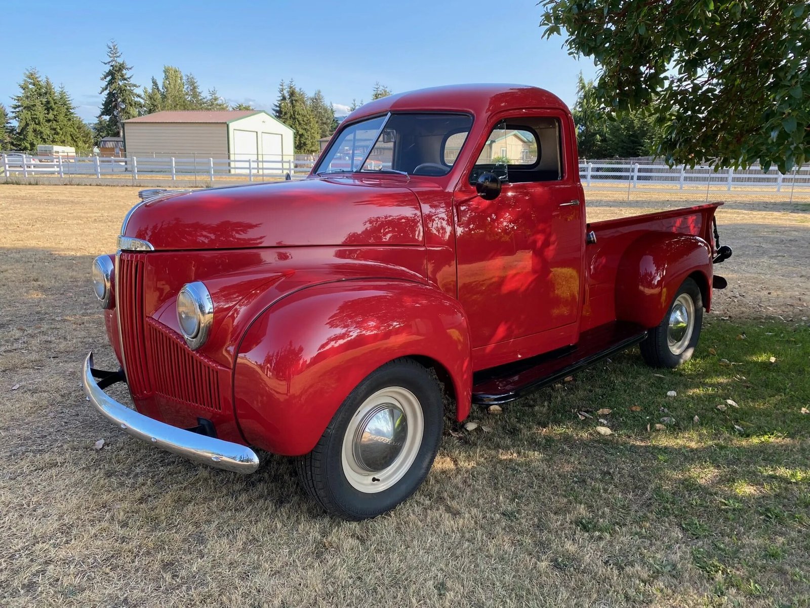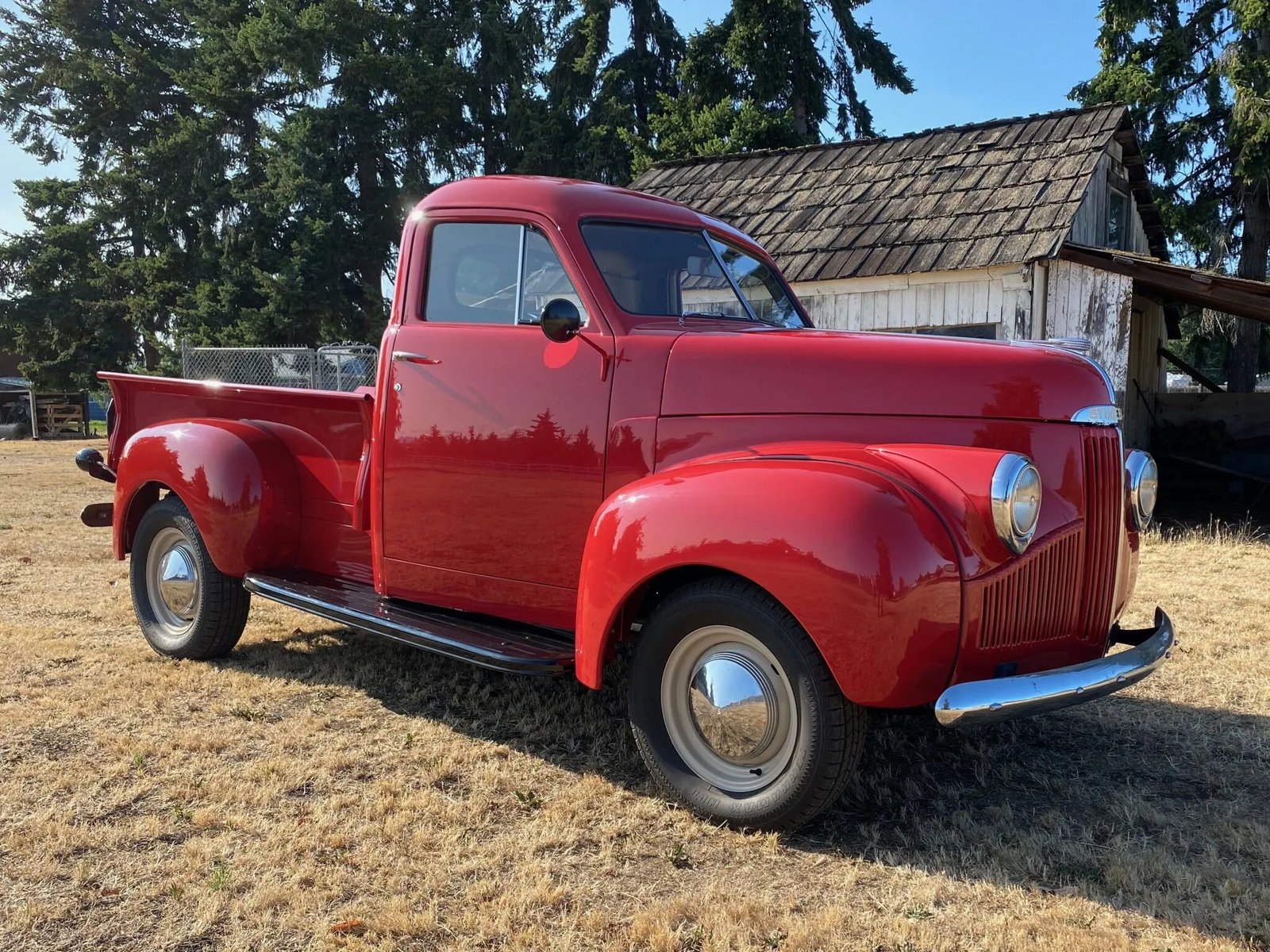 This 1946 Studebaker M5 pickup was disassembled and refinished in red over a brown and tan interior, and its 170ci Champion inline-six was cleaned, the cylinder-head gasket replaced, and the carburetor rebuilt. The three-speed manual transmission was inspected, the fuel tank was cleaned, the fuel lines were replaced, and the fluids have been changed. The electrical system was also overhauled, and a turn-signal system was added. The wheels were powdercoated, and the brakes as well as the tires were replaced.