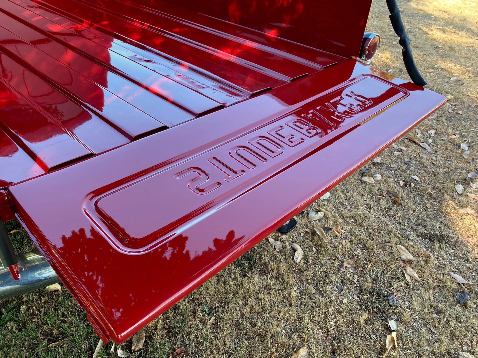 The fenders, bed, hood, doors, and running boards were removed for the refurbishment. Rust was repaired on the bottoms of the doors, and the running boards were powdercoated before their top sides were refinished in acrylic urethane. The body was refinished in red, and features include a custom-fabricated passenger-side mirror, dual-filament parking lamps to accommodate turn indicators, Trippe headlights with high beams, and vent windows.