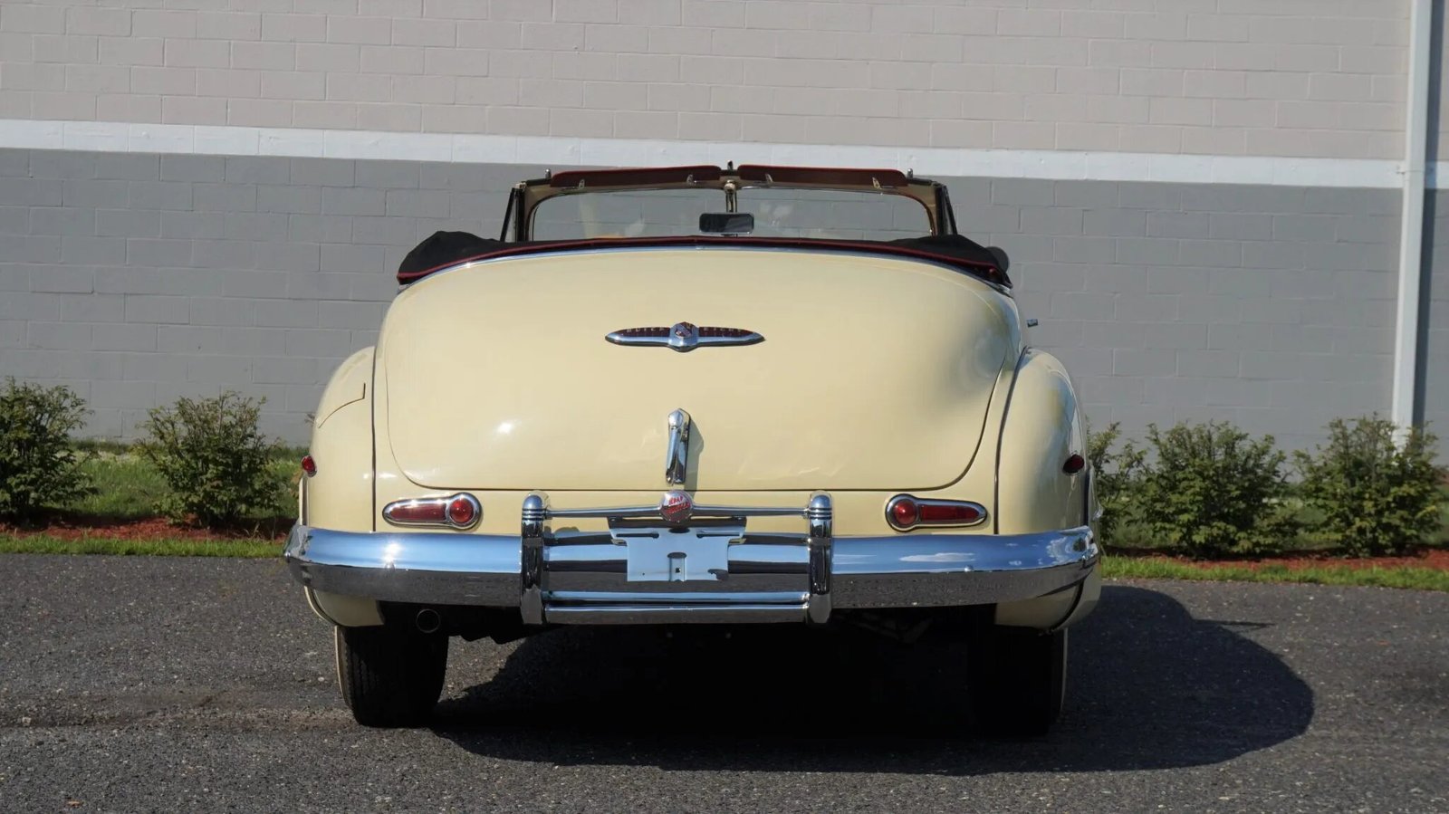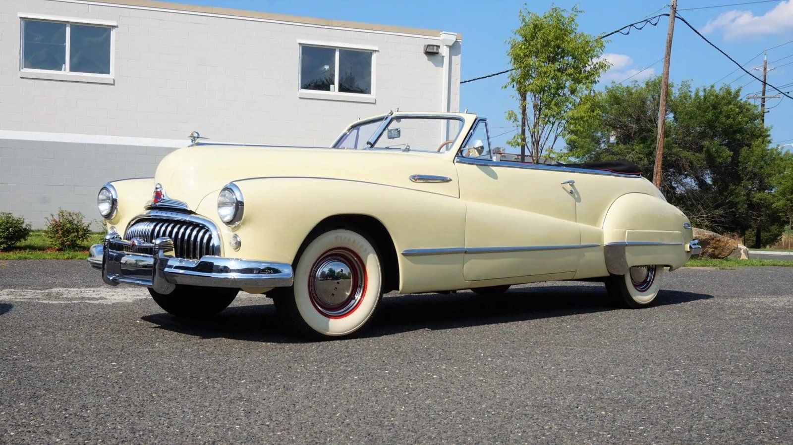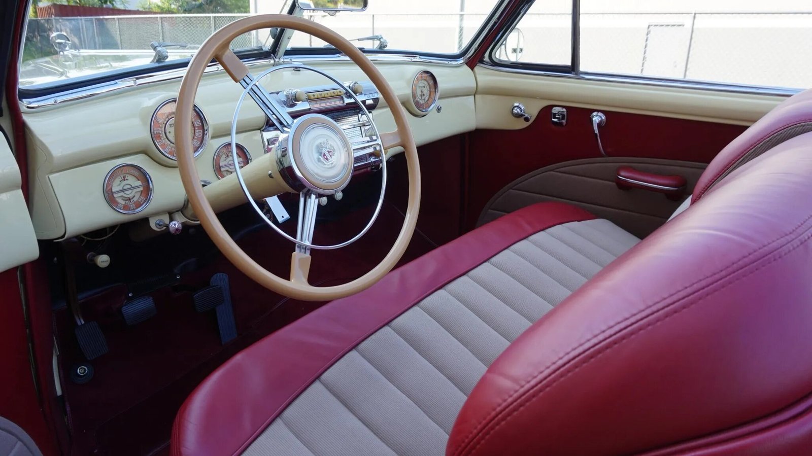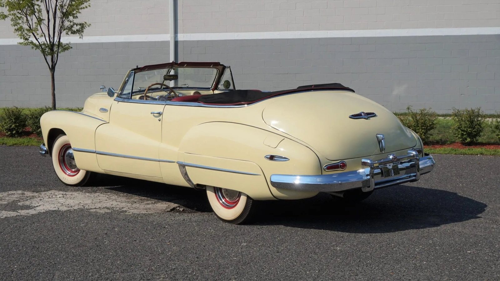 This 1947 Buick Roadmaster convertible is finished in Seqouia Cream over gray and red upholstery and powered by a 320ci Fireball straight-eight linked with a three-speed manual transmission. Features include a power-operated black soft top, rear fender skirts, a push-button Sonomatic radio, an antenna, power front windows, a power-adjustable front seat, a heater, Firestone whitewall tires, and 15″ steel wheels with Buick hubcaps. The car have been refurbished in the late 1990s, subsequent work consisted of replacing the battery and the fuel filter and also flushing the fuel system.