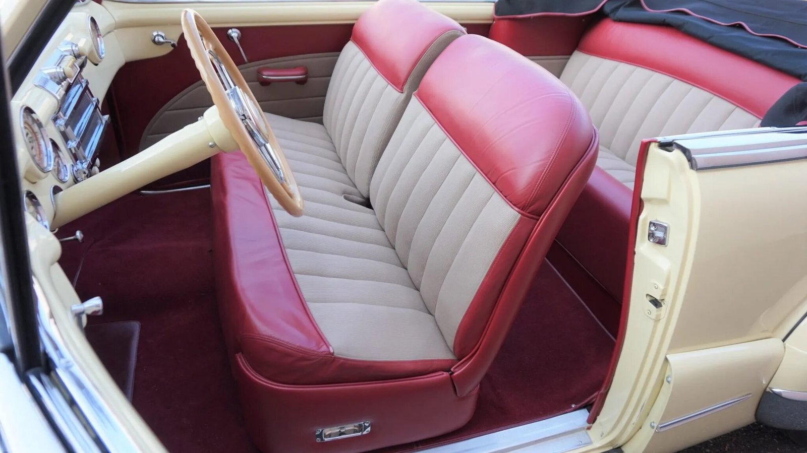 The 320ci Fireball straight-eight is fed by a single carburetor equipped with an oil-bath air cleaner and was rated at 144 horsepower when new. Work have consisted of flushing the fuel system as well as replacing the battery and the Carter fuel filter. The clamshell hood can open diagonally to the left or to the right. Power is sent to the rear wheels through a column-shifted three-speed manual transmission. An owner’s manual and a convertible-top operation guide will accompany the vehicle.