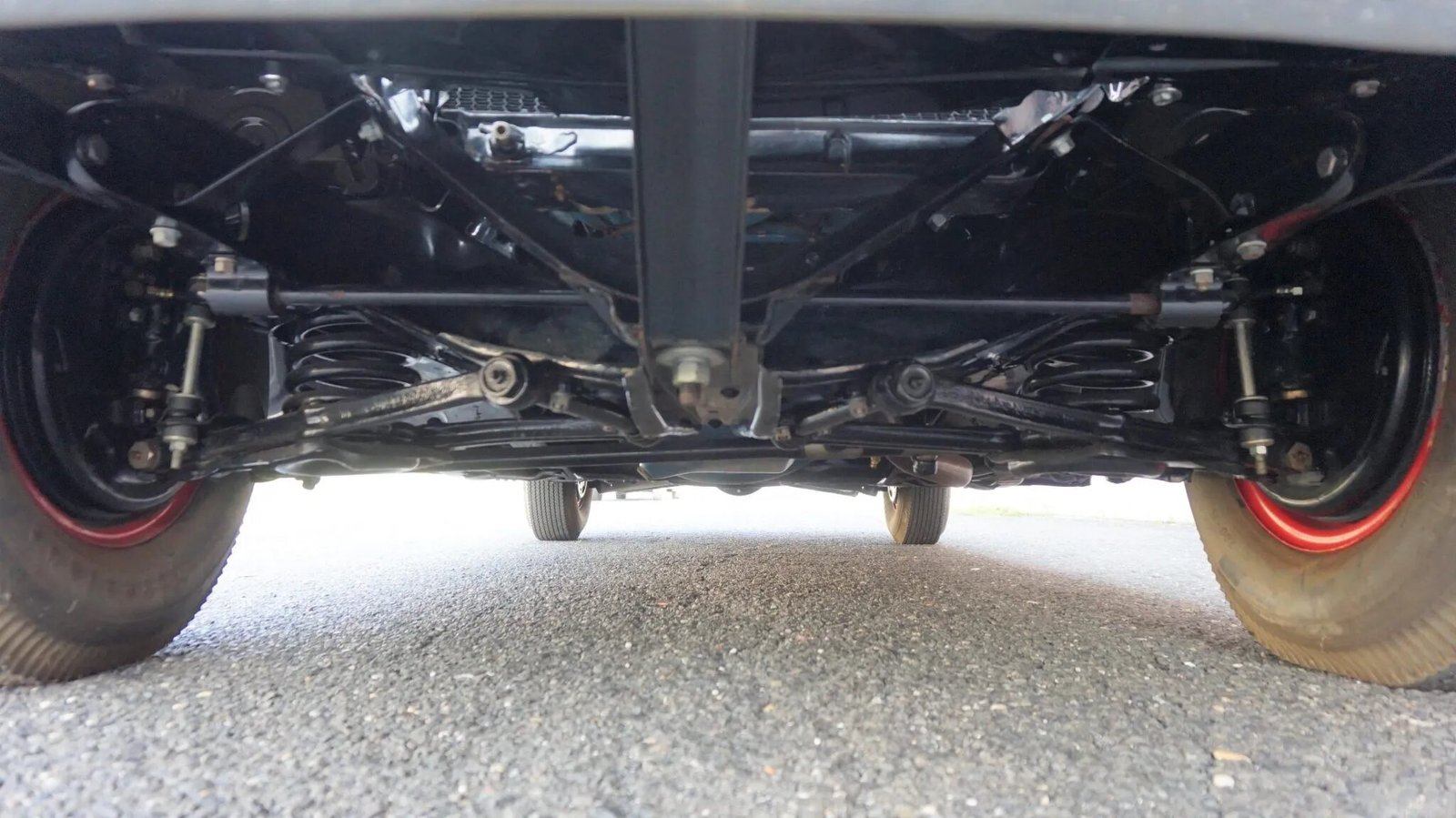 Red 15″ steel wheels wear chrome trim rings and Buick hubcaps and are mounted with 7.00-15″ Firestone Deluxe Champion whitewall tires. A matching spare is located in the trunk. Braking is handled by four-wheel drums.