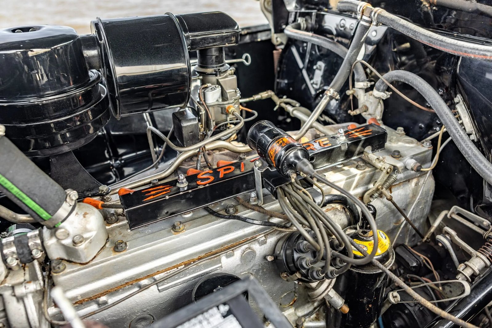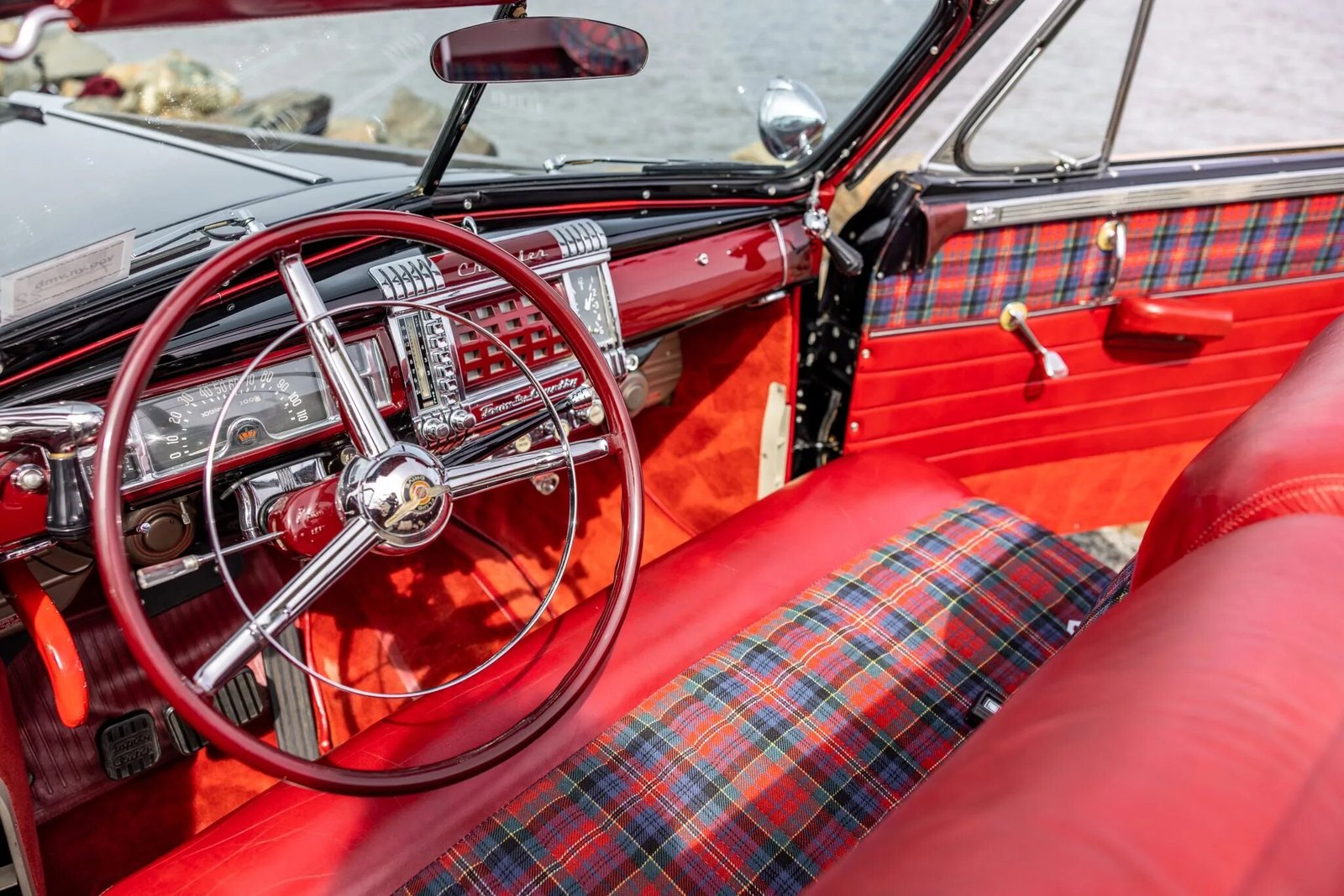 The car is finished in black with white ash and mahogany wood trim panels over custom red leather upholstery with Highlander plaid wool inserts, and power comes from a numbers-matching 323.5ci L-head straight-eight paired with an M-5 Fluid Drive semi-automatic transmission. Features include an electrically-operated black soft top with red piping, dual spotlights and mirrors, driving lamps, an electric fuel pump, dual heaters, an AM radio, and custom rear passenger windscreens.