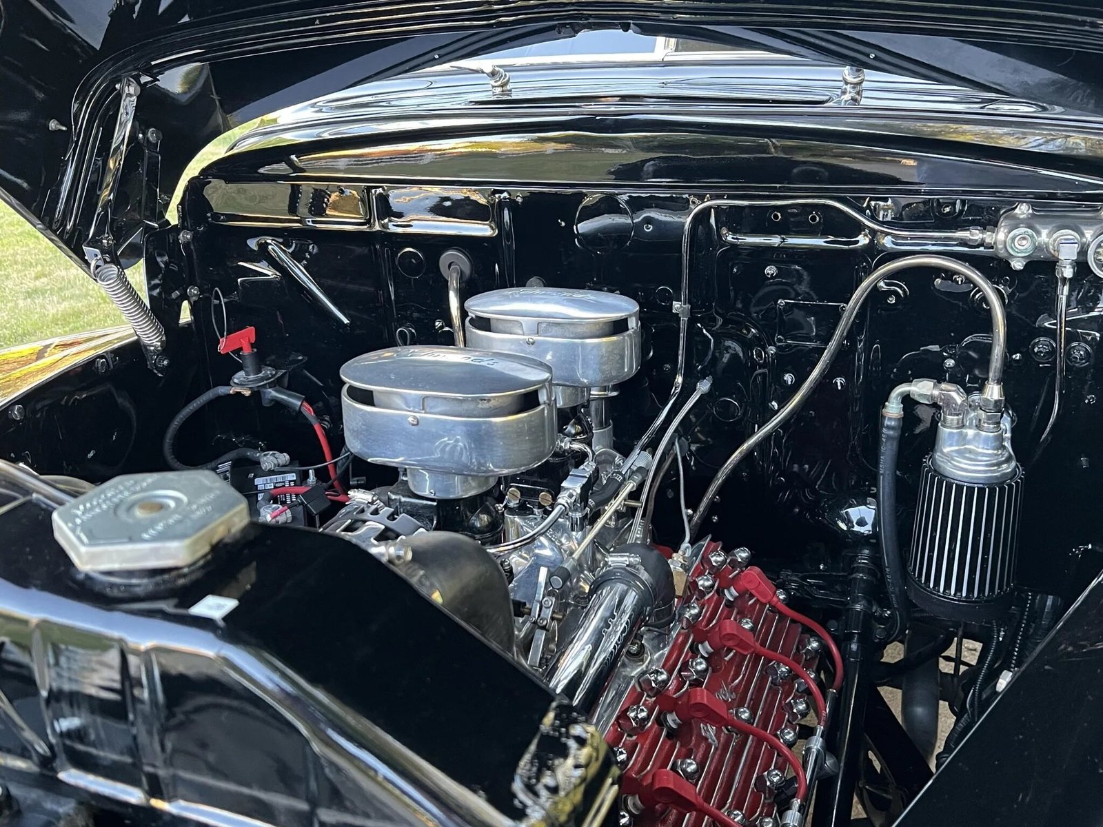 The 239ci flathead V8 have been rebuilt approximately two decades ago and features Edelbrock cylinder heads as well as dual two-barrel carburetors with Edmunds air cleaners affixed to a Navarro intake manifold.