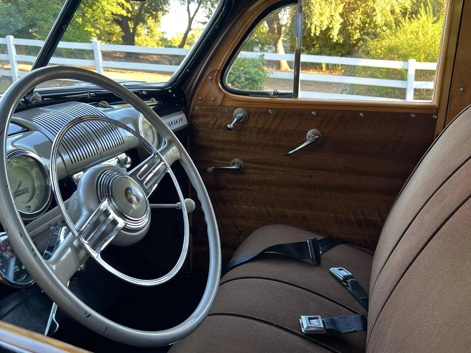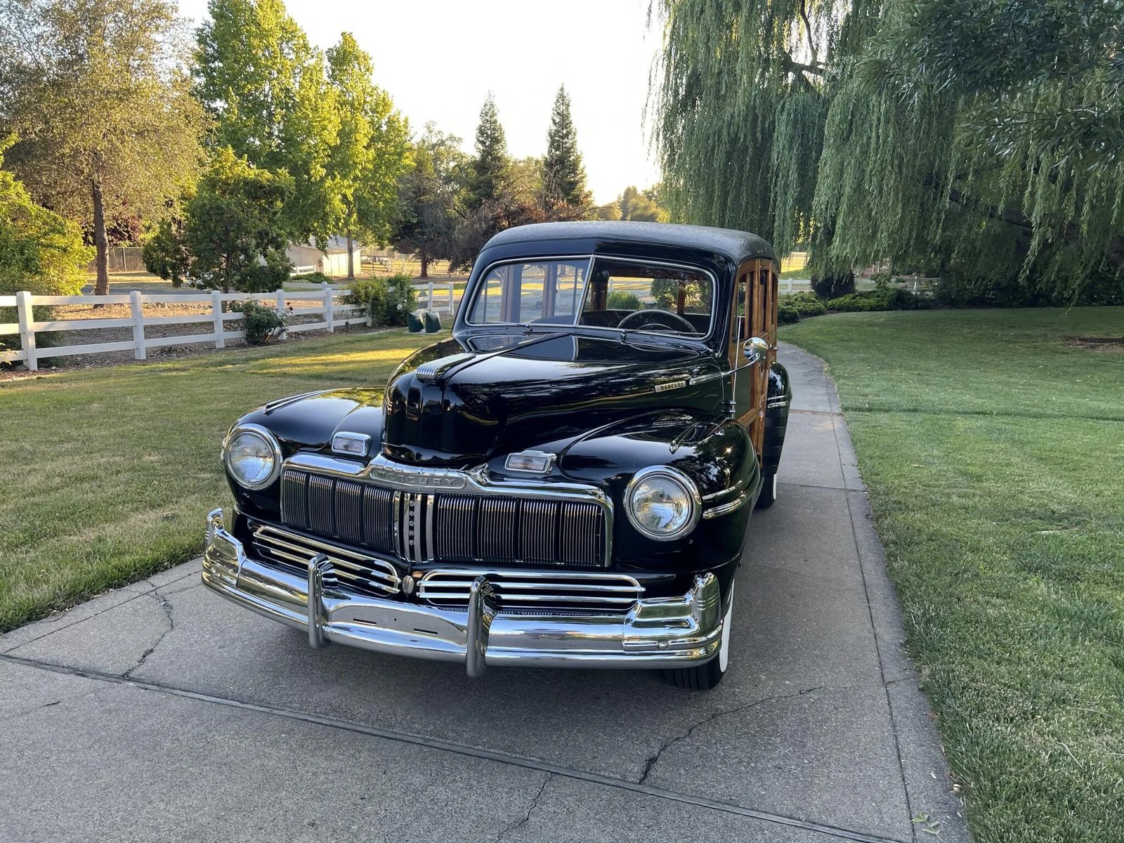 It is finished in black with wood paneling over brown mohair upholstery, and power is from a 239ci flathead V8 equipped with Edelbrock cylinder heads and dual carburetors paired with a column-shifted three-speed manual transmission.