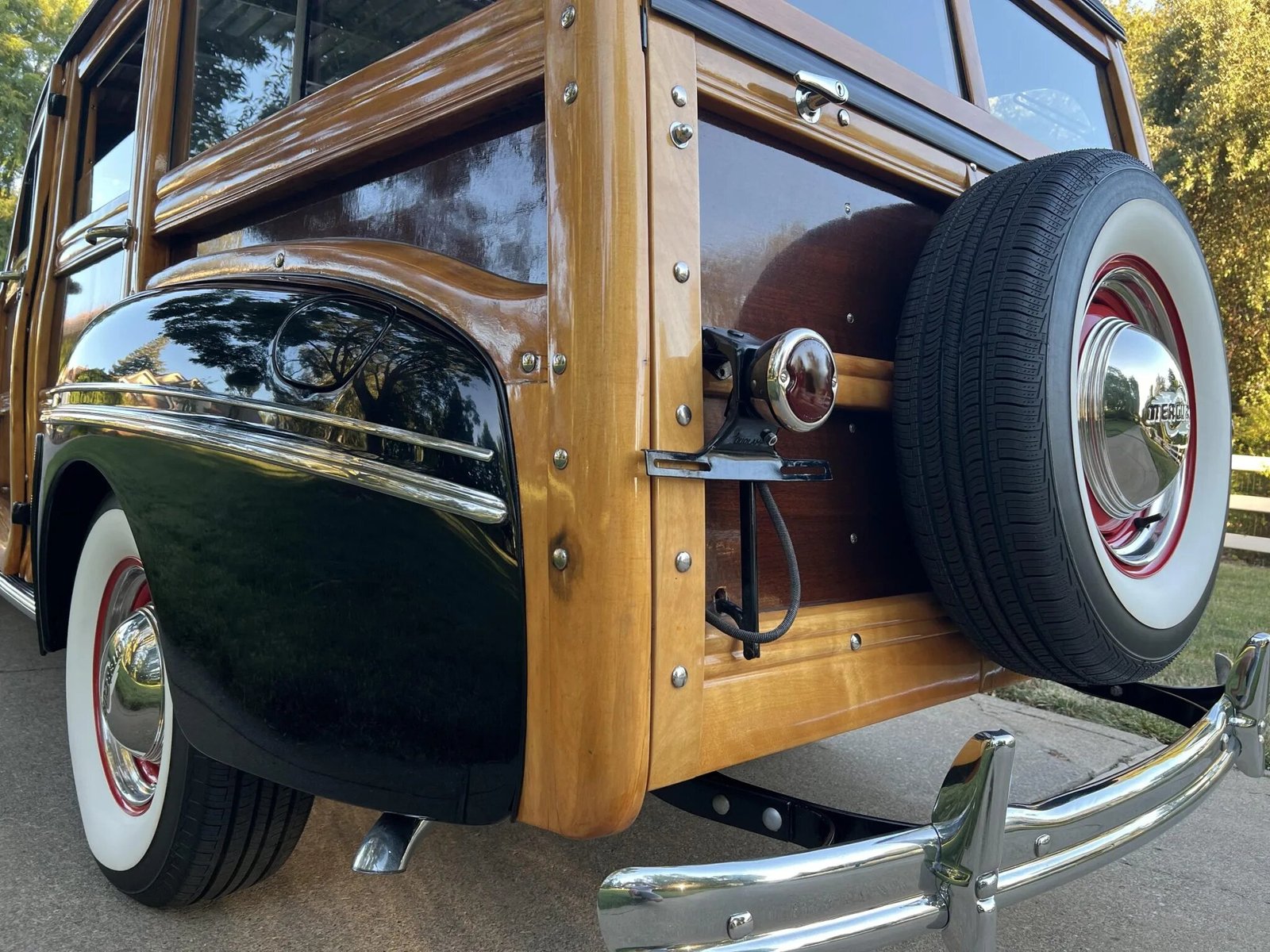 Red-painted 15” steel wheels feature chrome Mercury-branded hubcaps and trim rings and are mounted with whitewall tires.