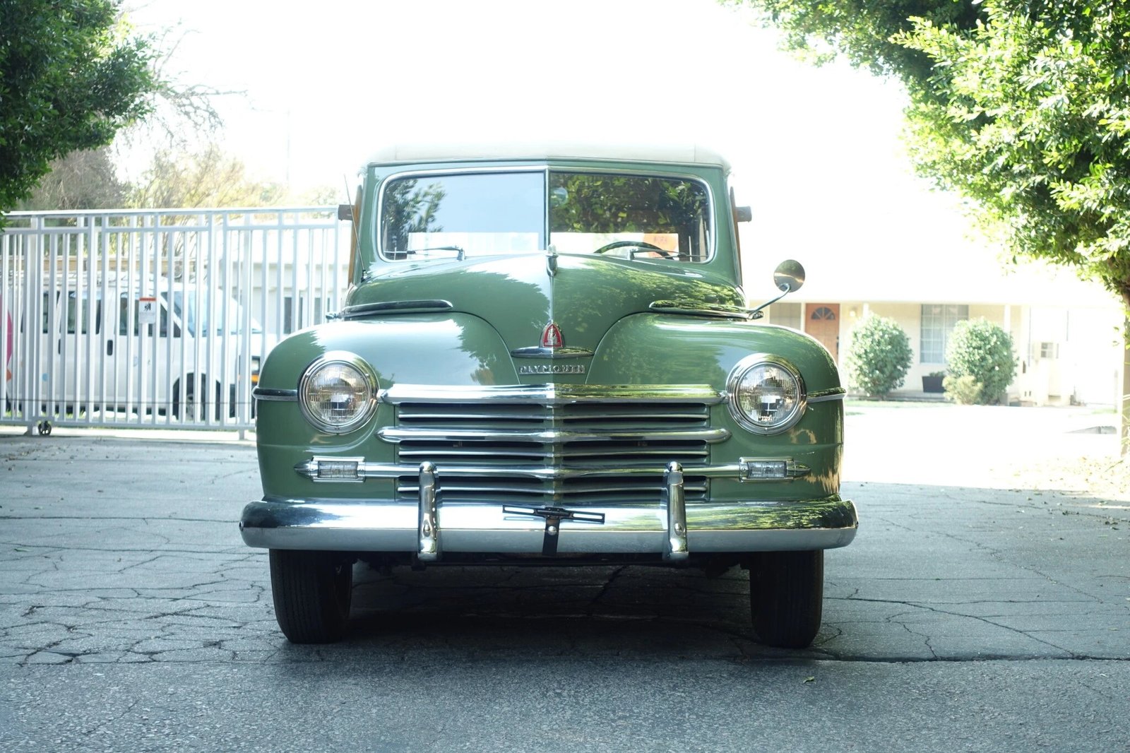 Green-painted 15″ steel wheels feature cream pinstriping, Plymouth hubcaps, bright trim rings, and whitewall tires.