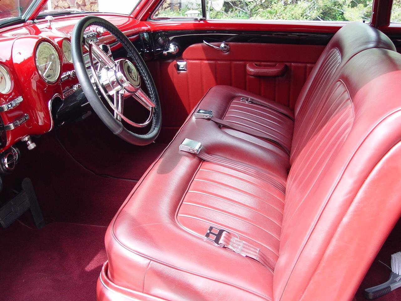 The cabin features front and rear bench seats trimmed in red vinyl upholstery with a color-matching headliner, dashboard, door panels, and carpets.