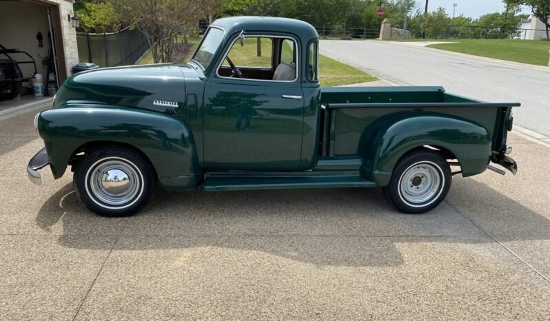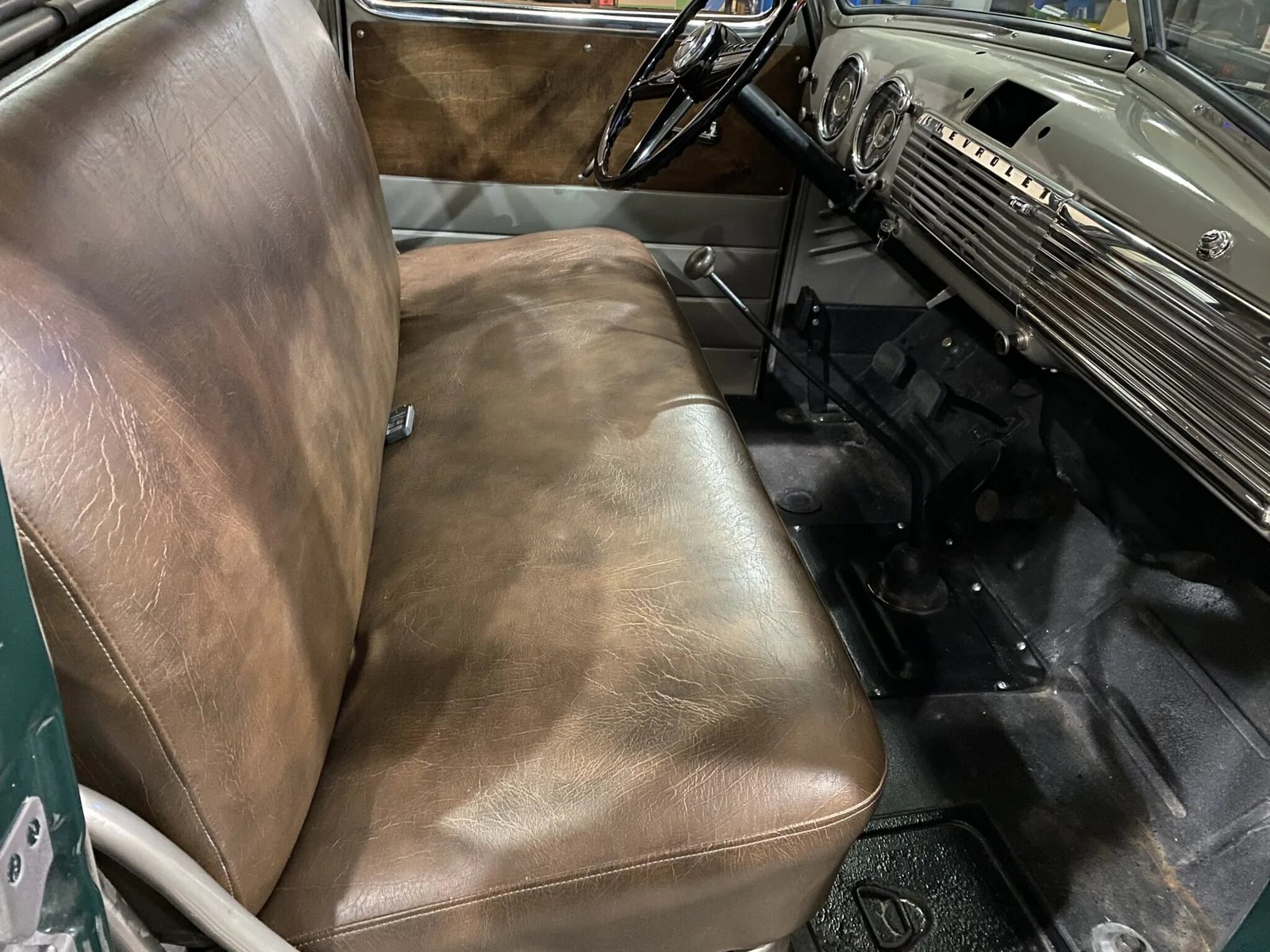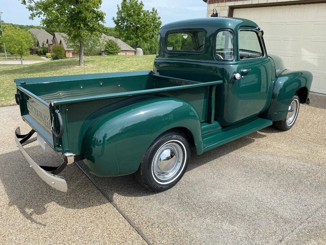 This 1949 Chevrolet 3100 is a five-window half-ton pickup that is finished in green over tan vinyl and powered by a replacement 235ci inline-six paired with a four-speed manual transmission.