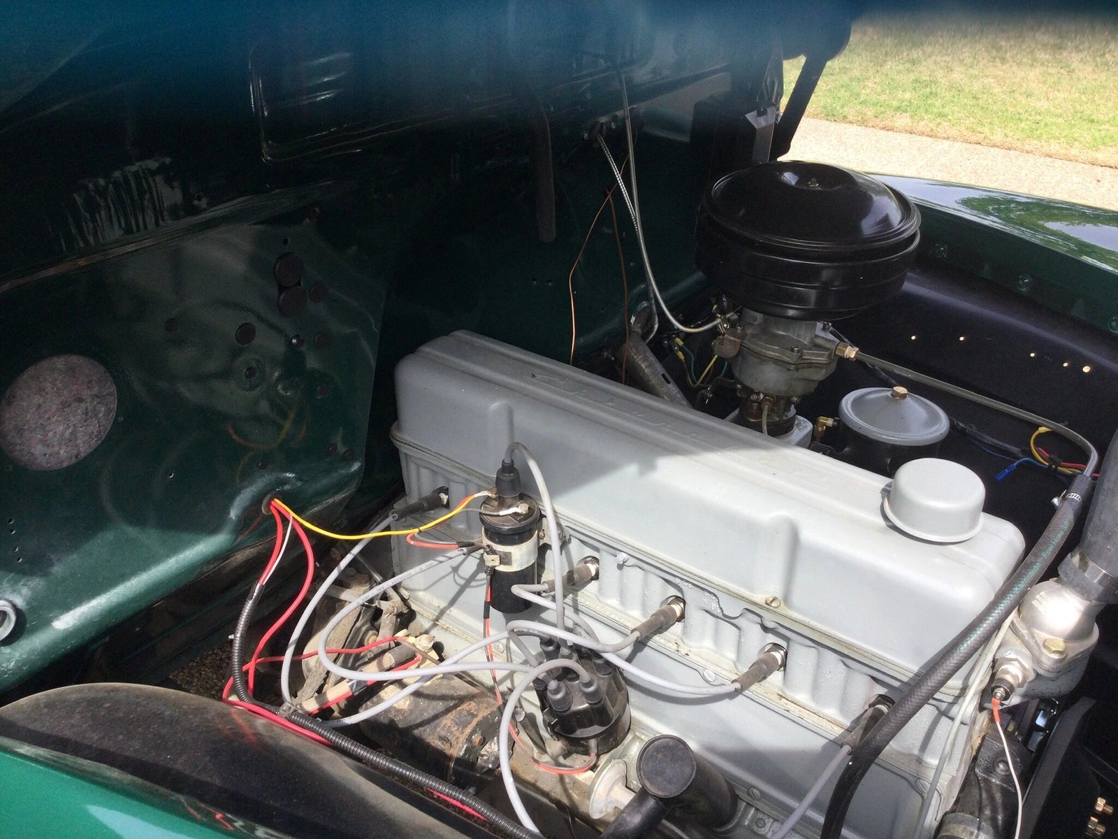 Chrome front grille and bumpers and bright trim on the headlight surrounds, windows, and split windshield.