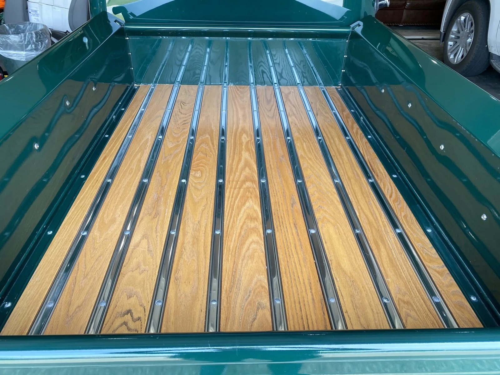 Additional exterior details include an engine air vent, dual side mirrors, and wooden bed slats.