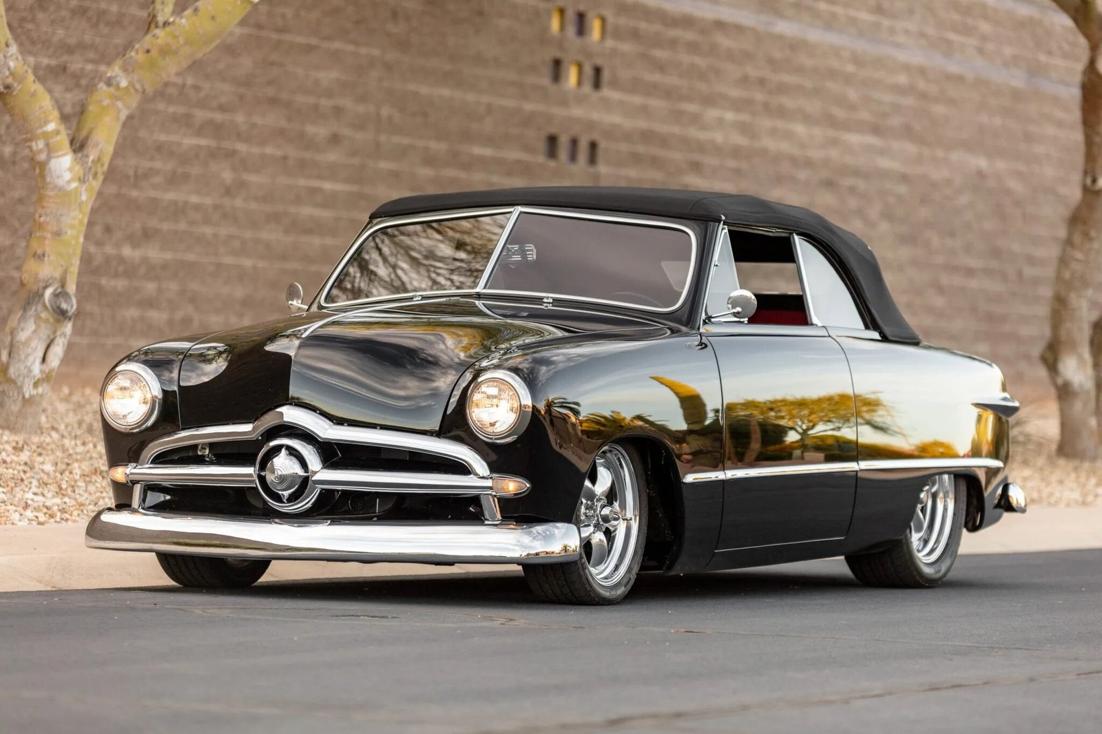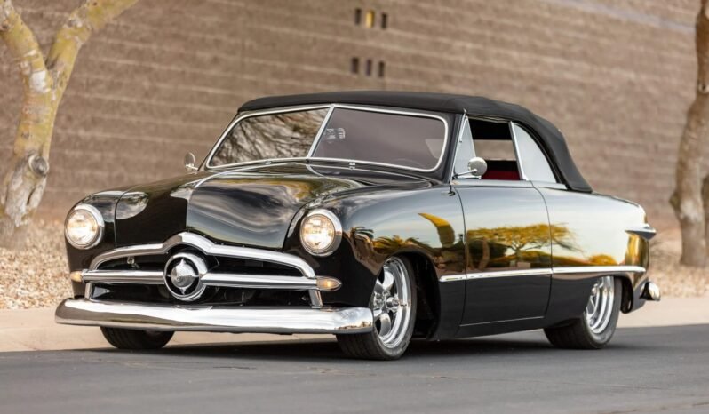 This 1949 Ford Custom convertible is finished in black over red leather and powered by a 4.6-liter DOHC V8 paired with a five-speed manual transmission and a Winters nine-inch rear axle.