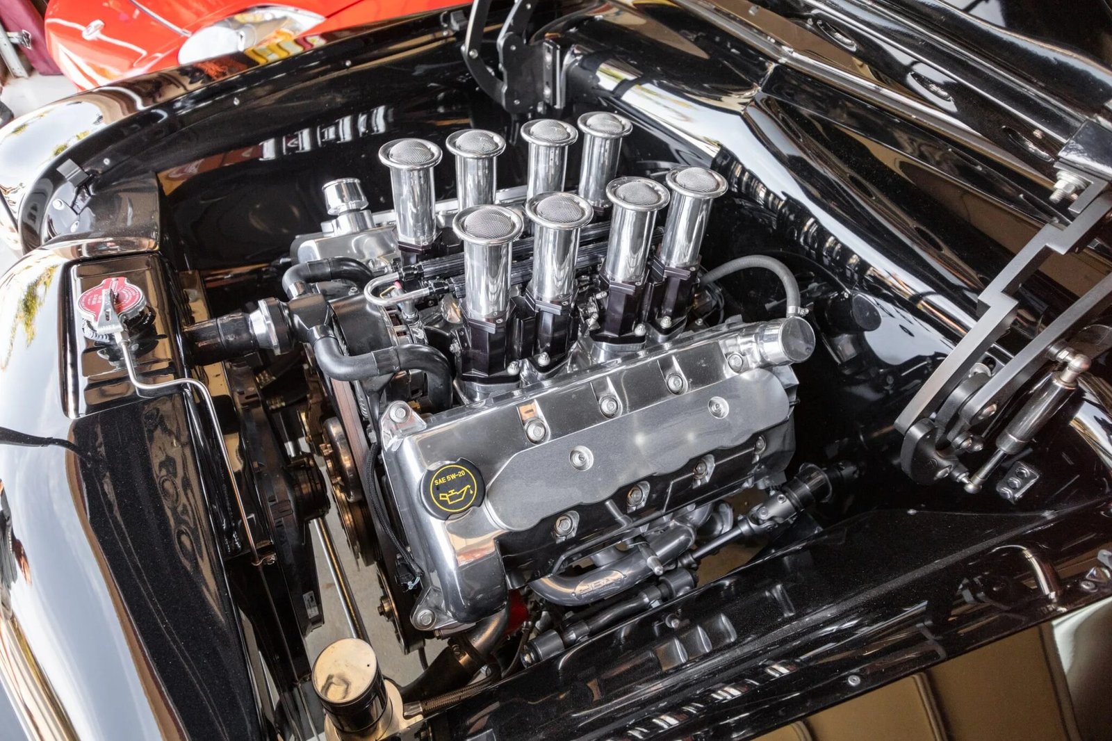 Features include an aluminum radiator with an electric fan, eight-stack fuel injection, polished valve covers, and ceramic-coated JBA tubular headers.