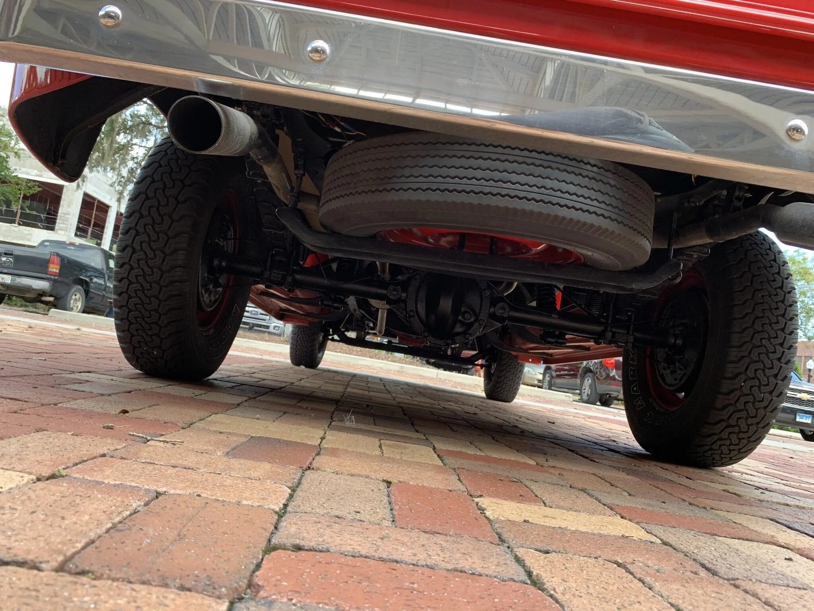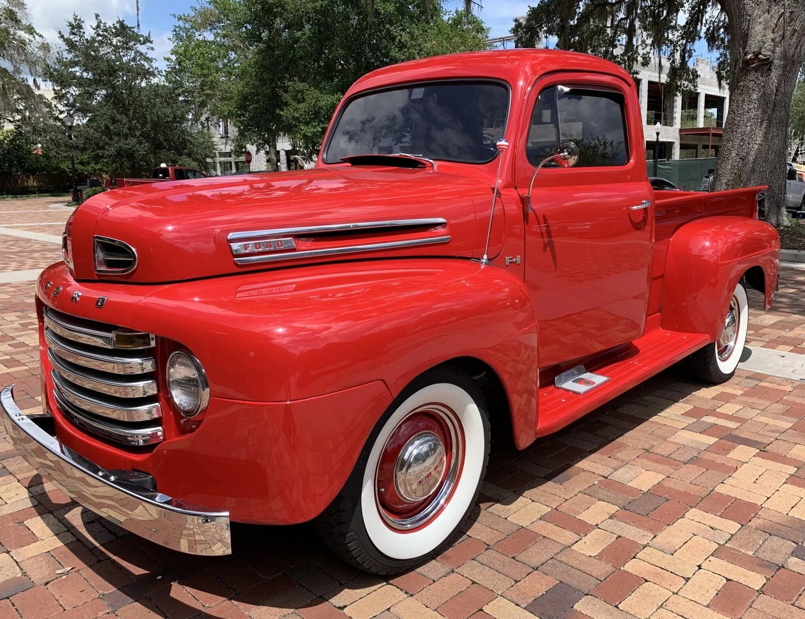 The truck was refinished in red and features chrome bumpers, dual side mirrors, a step-side bed with a wood plank floor, and dual-exhaust outlets.