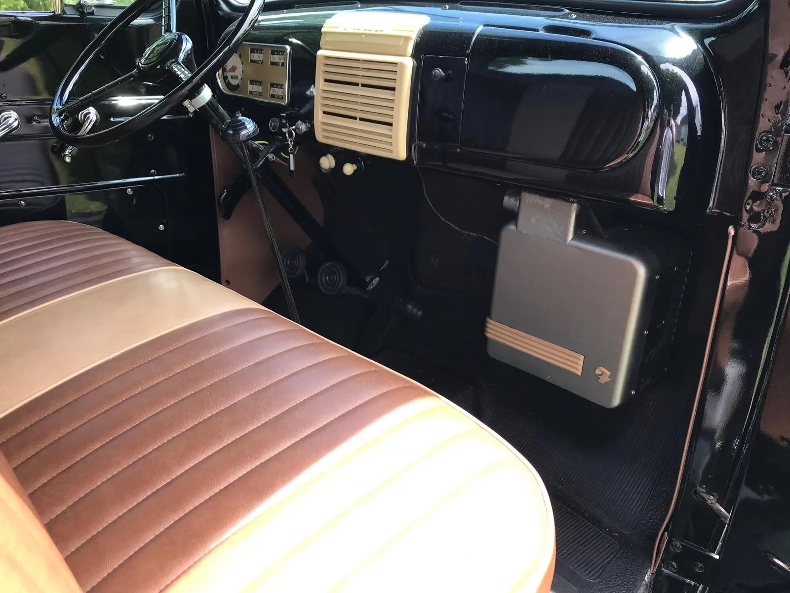 The bench seat was reupholstered in brown and tan vinyl over additional padding on the ends, while insulation and a custom mat were added to the floor.