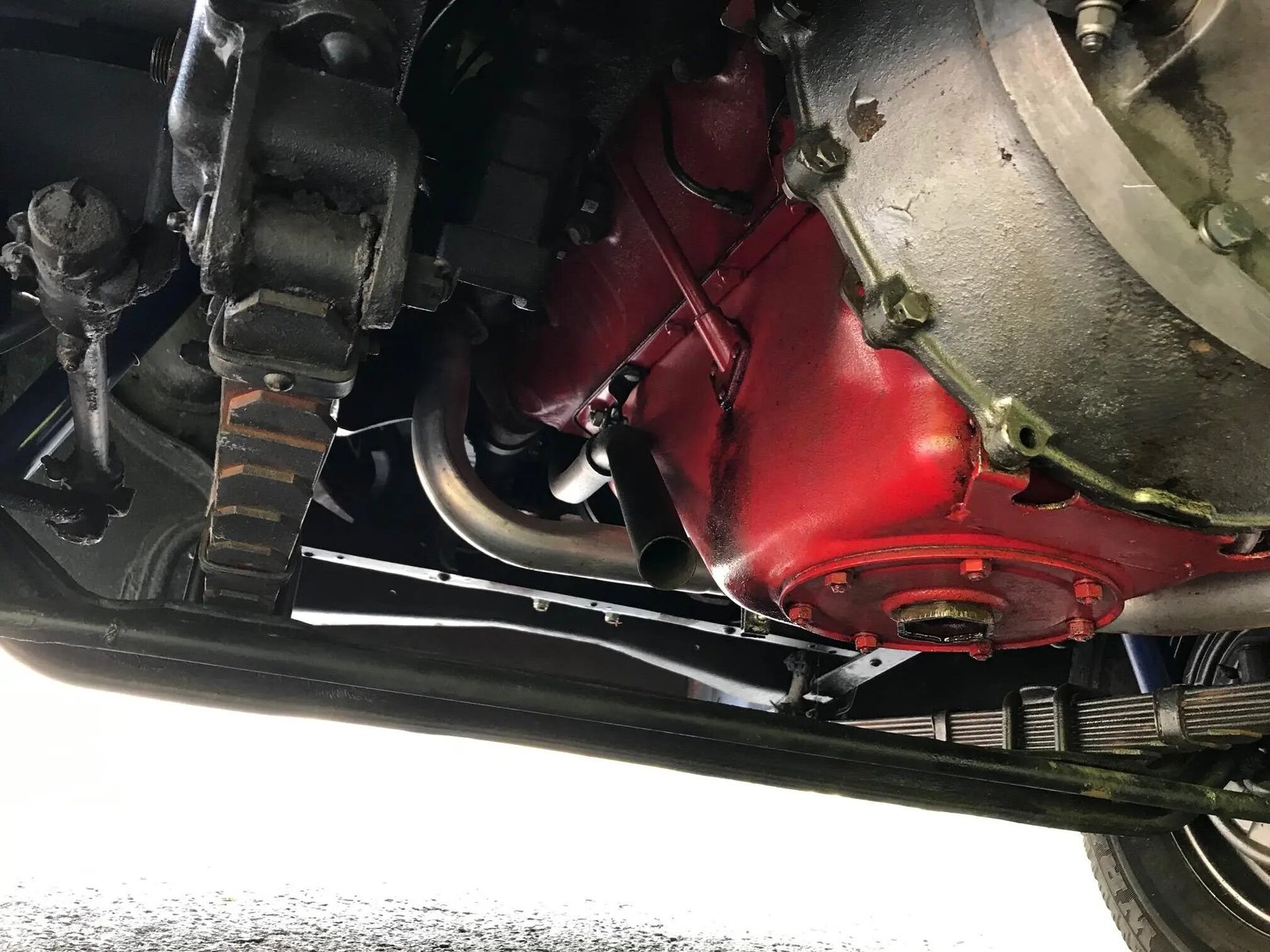 A fully-synchronized five-speed T5 manual transmission was installed in place of the factory three-speed using an adapter from Speedway Motors.