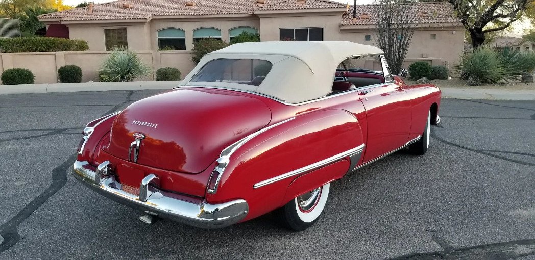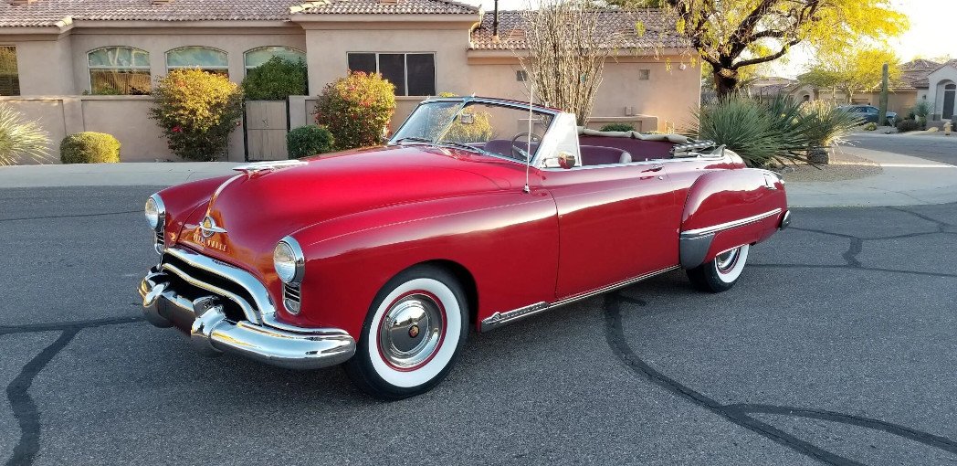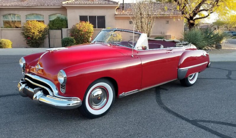 This 1949 Oldsmobile Futuramic 98 convertible is finished in red over red and tan vinyl upholstery and powered by a 303ci Rocket V8 paired with a four-speed automatic transmission.