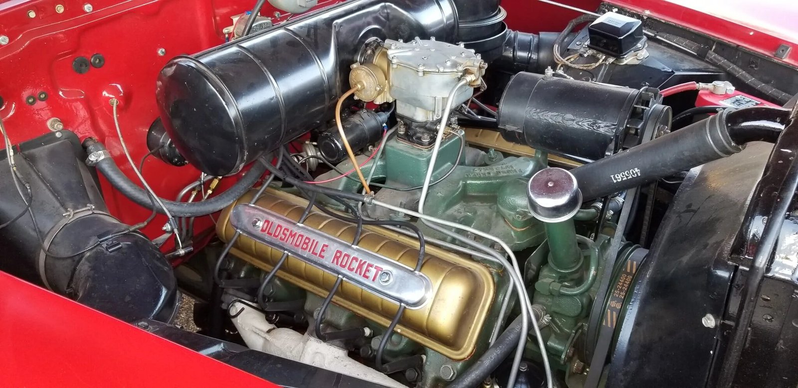 The 303ci Rocket V8 is equipped with a two-barrel Rochester “turtleback” carburetor and was factory rated at 135 horsepower and 263 lb-ft of torque.