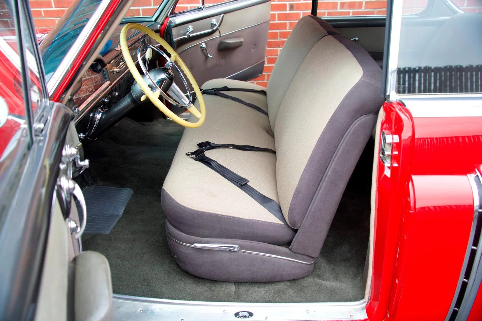 Gray carpeting covers the floors, and an AM Selector radio is located in the dashboard alongside an analog clock. Black lap belts have been fitted up front.
