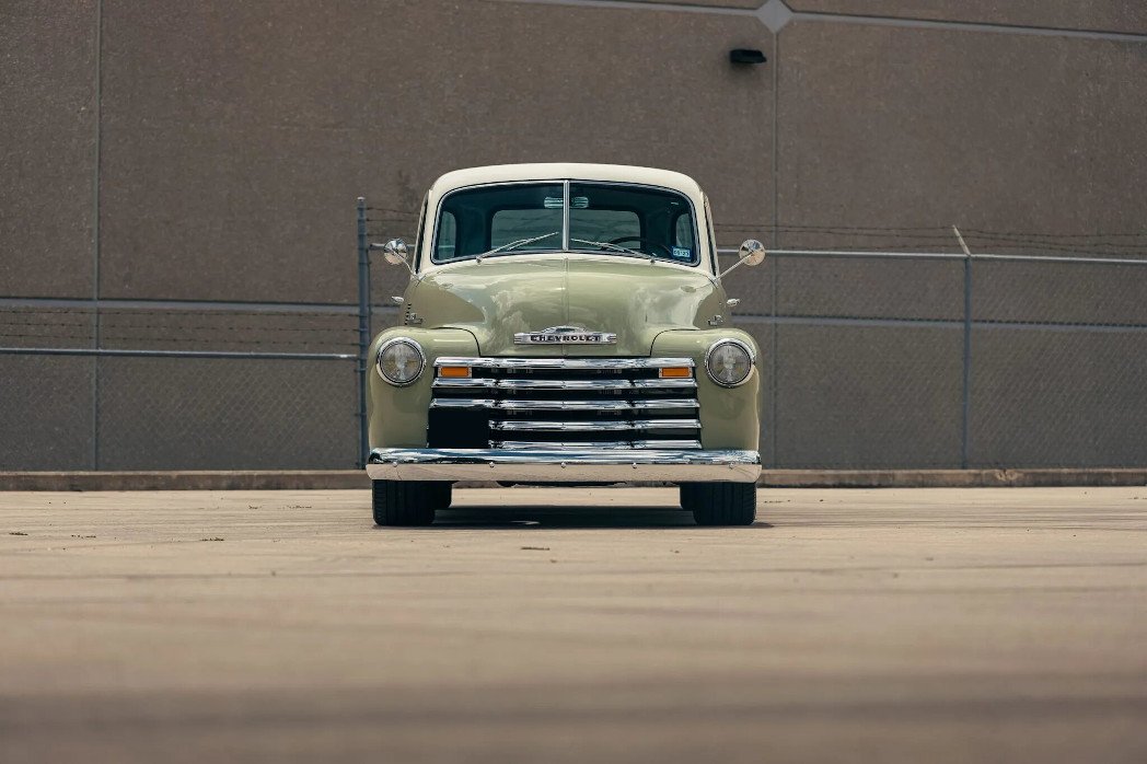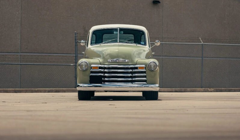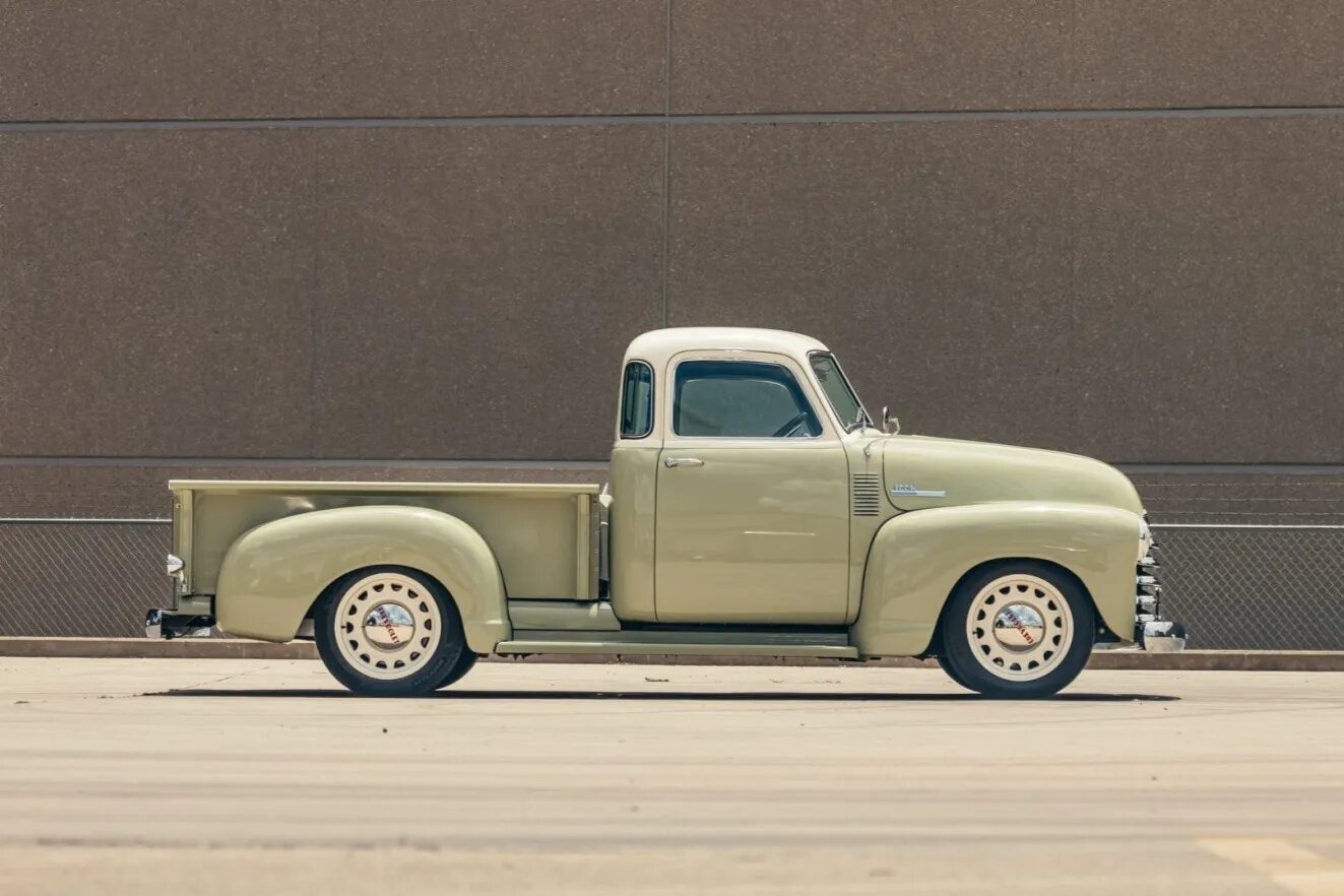 This 1950 Chevrolet 3100 is a five-window pickup that was built by ICON 4×4 in 2019 and is designated as the 10th example built of the ICON TR “Old School 5-Window” series. The truck is finished in olive green and white over brown leather upholstery, and power comes from a 6.2-liter LS3 V8 linked with a 4L65E four-speed automatic transmission and a limited-slip rear differential. Additional equipment includes an Art Morrison chassis, fully independent suspension, Brembo disc brakes with a hydraulic booster, 18″ artillery-style wheels, a wood cargo bed floor, Dakota Digital gauges, Vintage Air climate control, power windows & locks, a Bluetooth receiver, and an Audison sound system with Focal speakers.