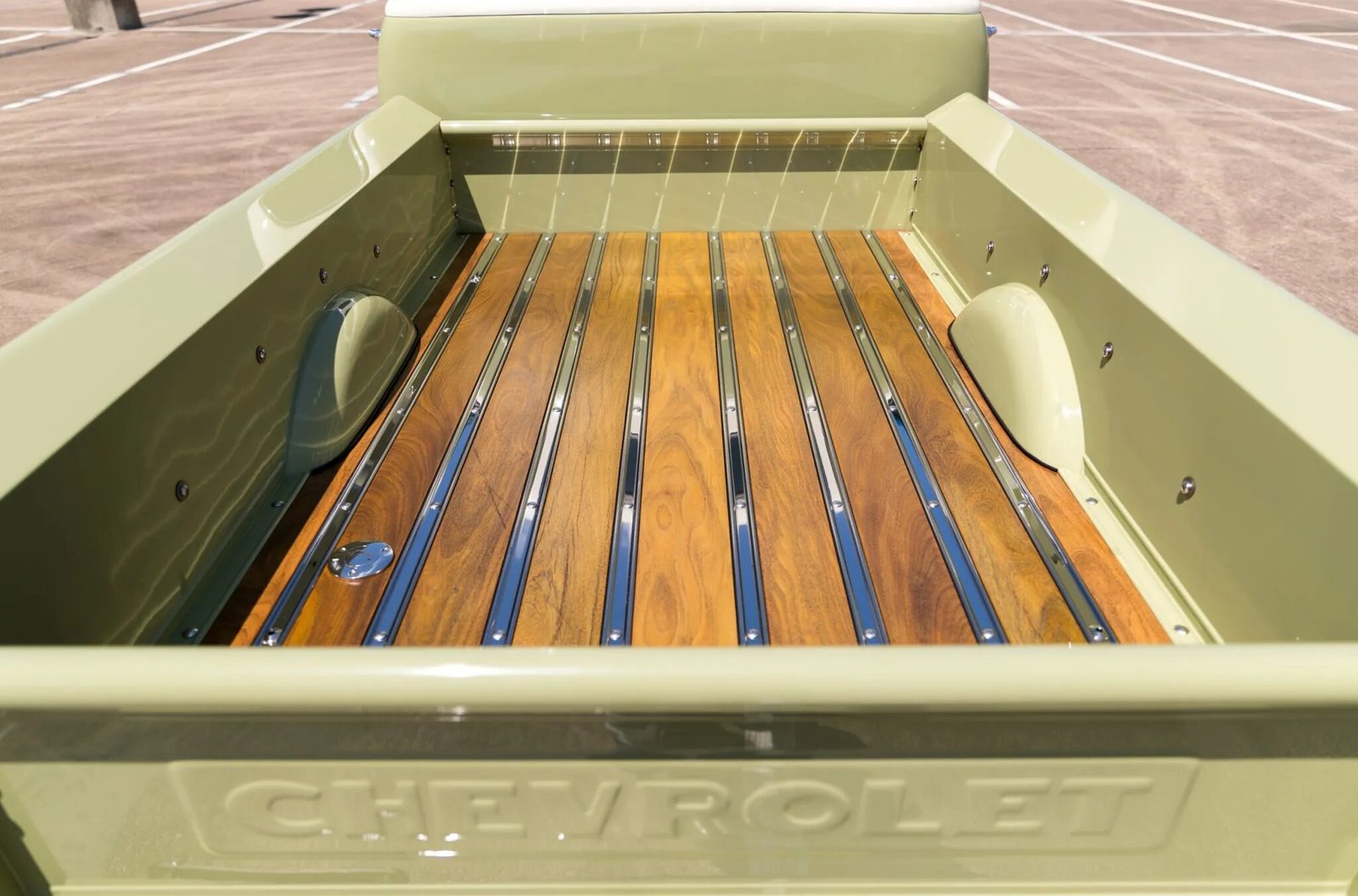 The truck is equipped with an Art Morrison chassis, a fully independent suspension system, and coilover shock absorbers.