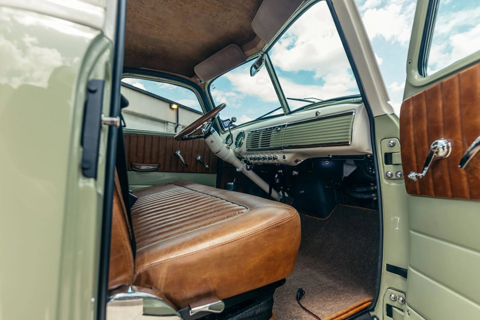 The cab houses a bench seat upholstered in brown leather with green piping along with a color coordinated headliner, door panels, sun visors, and carpeting.