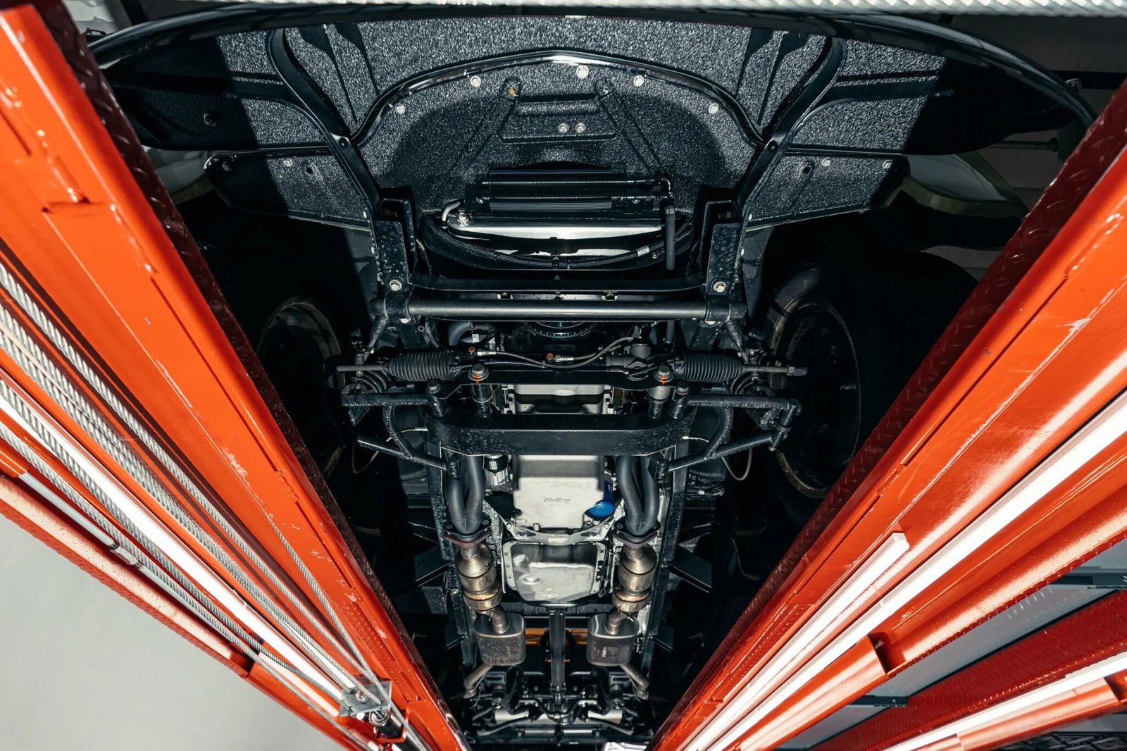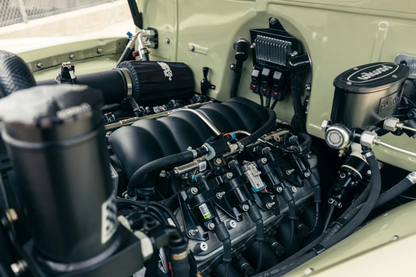 The 6.2-liter LS3 E-Rod V8 utilizes an aluminum block and cylinder heads as well as a Holley oil pan.