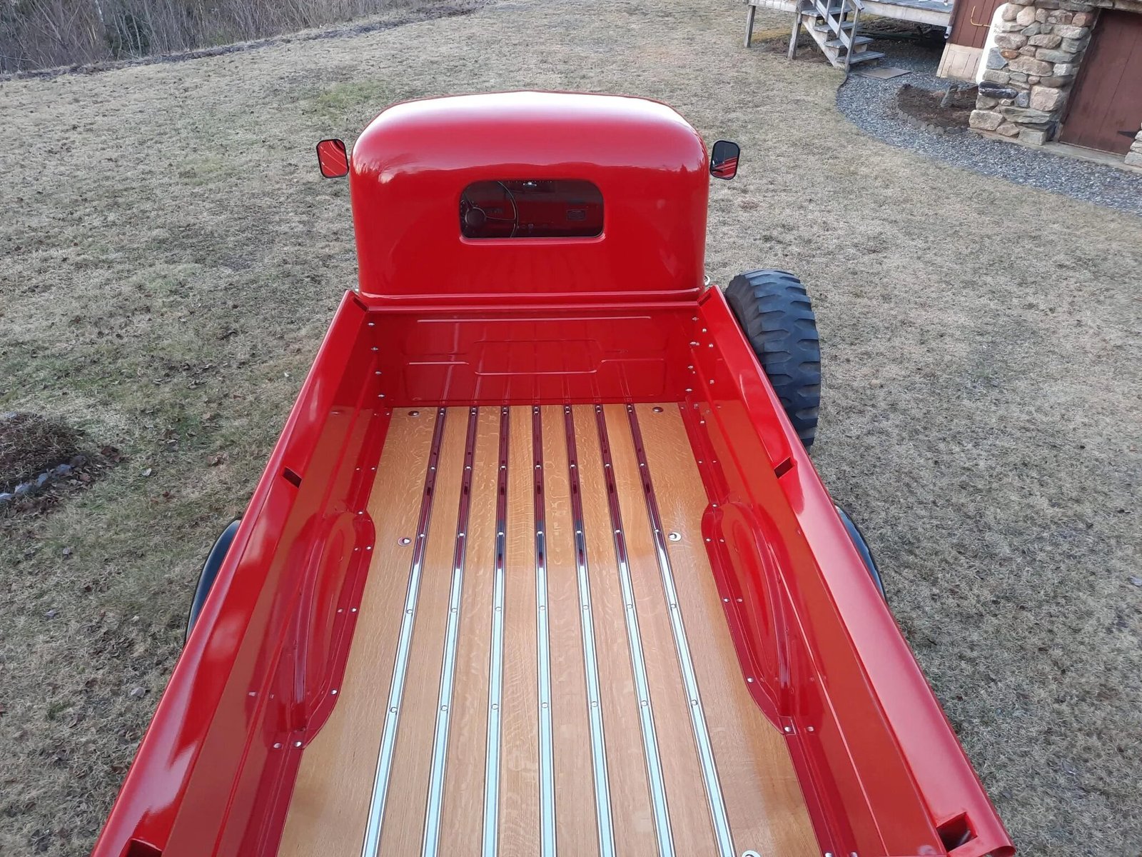 Equipment includes a black front bumper, a white oak bed floor with aluminum skid strips, running boards, and fenders as well as a pop-out split windshield, dual side mirrors, a PTO front winch, a pintle hitch, and turn-signal indicators.