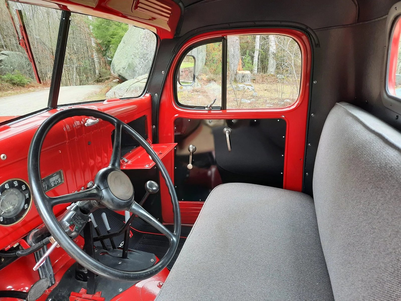 The cab features a bench seat that was reupholstered in gray cloth.