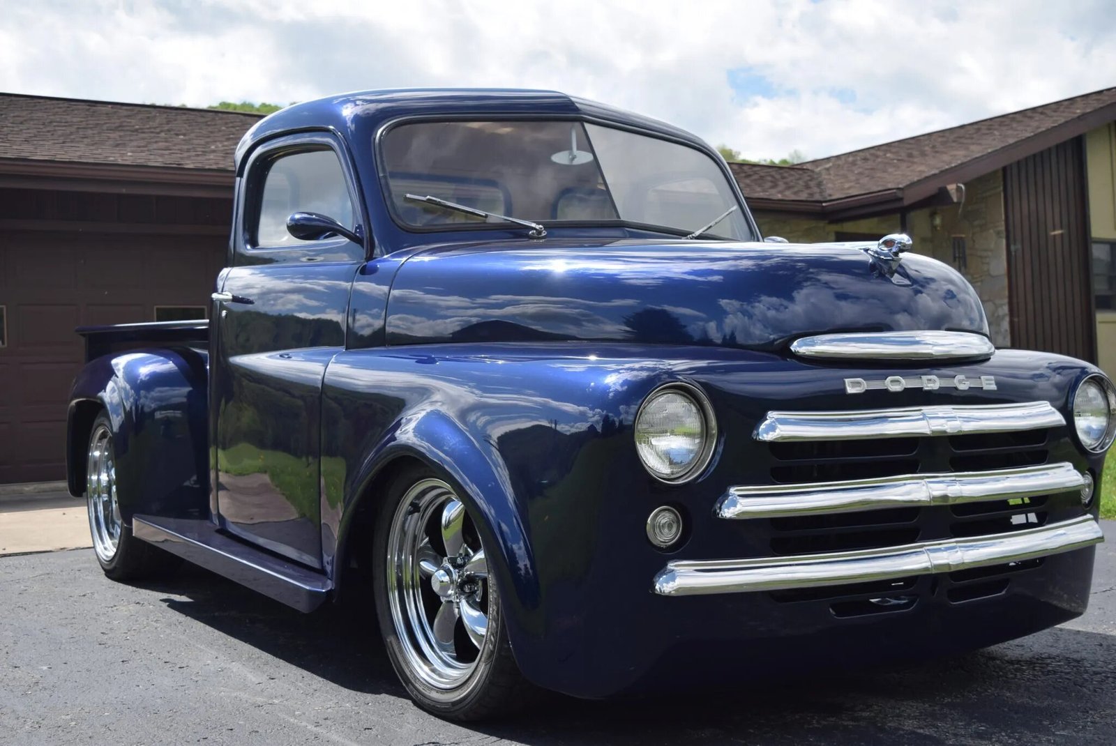 The roof was reportedly lowered 2½” and the front facia and truck bed were modified before the body was repainted in Midnight Blue Metallic.